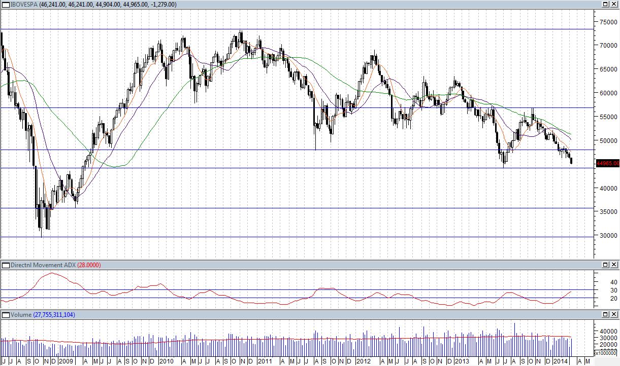 Essa semana foi meio tensa na bolsa brasileira, com queda de 2,76%, dando continuidade na tendência primária e secundária de baixa, apesar do forte repique de alta de julho/2013 a outubro/2013. Se o IBOV cair abaixo do suporte de 44107 pode indicar um grande sinal baixista, já que esse ponto é o valor mais baixo para o índice nos últimos 5 anos e o próximo suporte importante será na região dos 35721 pontos.