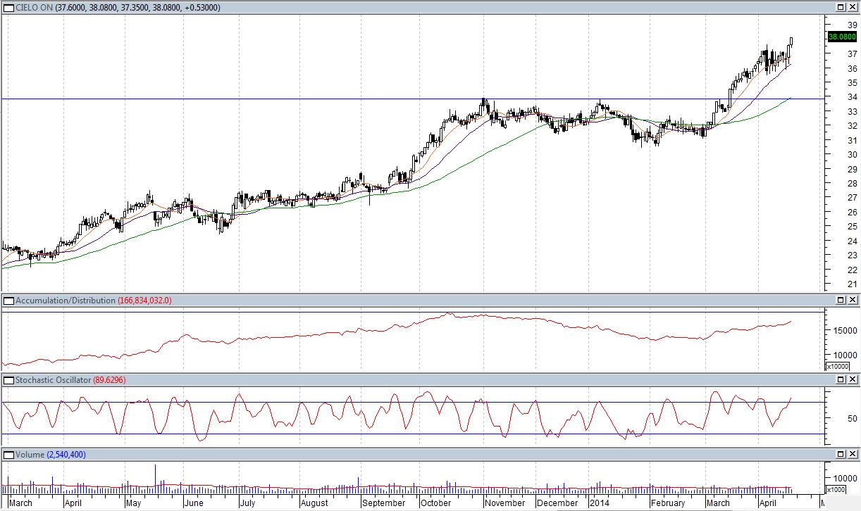 Essa semana passada poderia ter dado uma entrada por rompimento de resistência de topo histórico na CIEL3, porém o indicador Acumulação/Distribuição está indicando uma divergência, não está sustentando a alta. Prefiro aguardar mais umas semanas. Veja o gráfico da CIEL3 no diário (onde acompanho o Acumulação/Distribuição):
