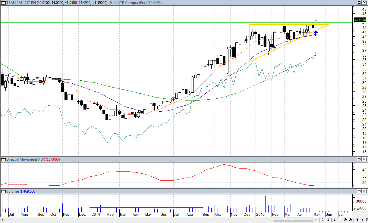 TRPL4 a R$43,06. O ADX estava baixo (15), fugindo um pouco da minha entrada tradicional, mas ela vinha de uma boa tendência de alta desde o início de 2014 onde o ADX chegou a 48 e então de janeiro para cá ela entrou em uma consolidação em triângulo ascendente, batendo 3 vezes na resistência superior. Devido a esse movimento lateral o ADX caiu abaixo de 20, que significa sem tendência, mas o rompimento dessa figura tende a ser muito poderosa, dando continuidade à tendência de alta anterior. Segue o gráfico: