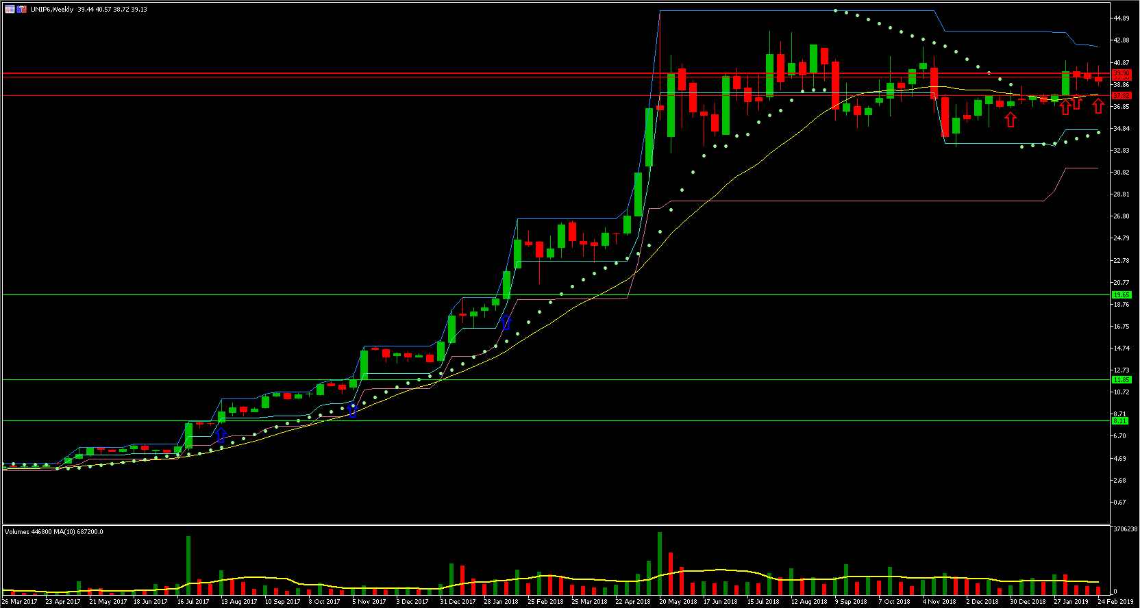Posições encerradas em UNIP6. O preço não bateu no stop móvel ATR mas a ação está em uma congestão desde maio de 2018 portanto resolvi encerrar antes para comprar outras ações mais promissoras para o momento, conforme previsto no meu plano de trade. A medida que fui comprando as novas ações fui vendendo as UNIP6 necessárias para cobrir, até que essa semana acabei de vender todas, foram no total 4 vendas em janeiro e fevereiro.