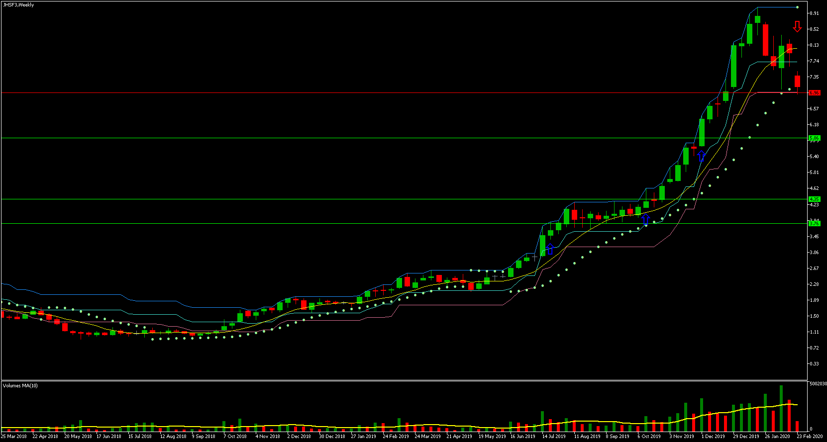 | 02/12/2019 | JHSF3 | 5,86 | Rompimento Semanal | 35,49% | 6,96 |