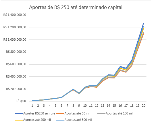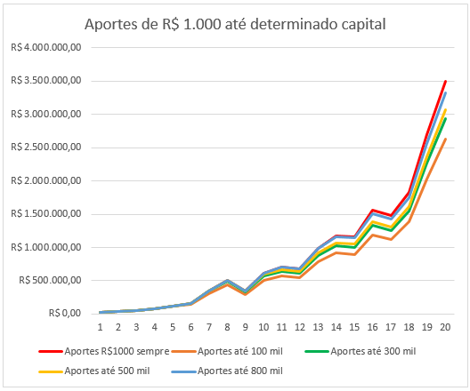 Que nenhum educador financeiro veja o que eu vou escrever, mas é perfeitamente aceitável parar ou diminuir os aportes após um certo valor acumulado! O valor acumulado para isso vai variar para cada um, e também será proporcional aos aportes, pois quanto maiores eles são, mais influencia no capital final. Vamos fazer mais algumas simulações sobre esse tema mais abaixo.