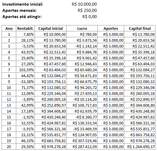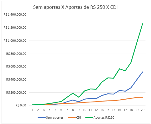 Agora, voltando para as ações, e se o trader resolvesse fazer aportes mensais de apenas R$ 250, que daria R$ 3 mil ao ano? Um valor pequeno desses faria muita diferença?