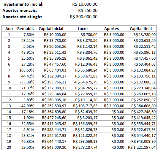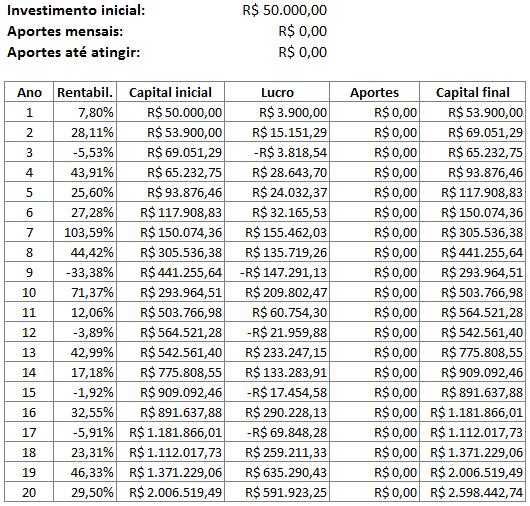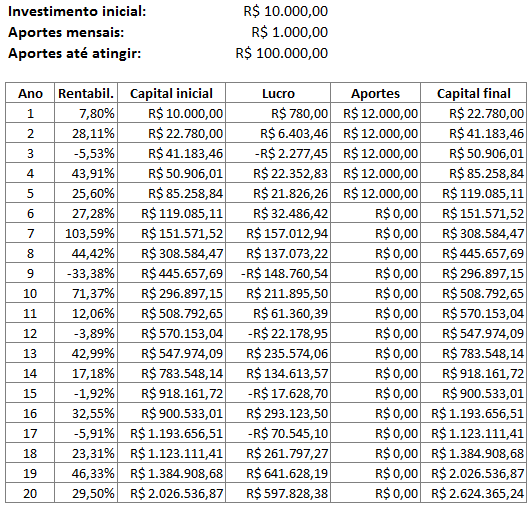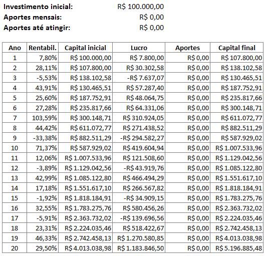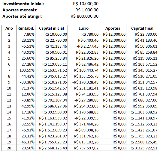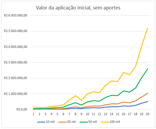 Vemos que um investimento inicial do dobro do valor, 20 mil reais, já atingiria o milhão em 20 anos. Um investimento de 50 mil teria atingido em 16 anos. Um investimento maior, de 100 mil, teria atingido em apenas 10 anos, e os próximos 10 anos teria virado incríveis R$ 5 milhões, uma bela aposentadoria hein!