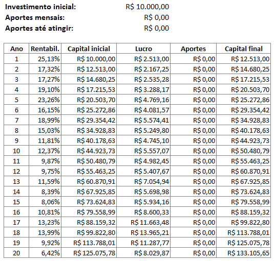 Também disponibilizo a planilha que montei para fazer as simulações desse artigo, onde é possível modificar para incluir novos anos, bem como colocar rendimentos diferentes a cada ano. Clique aqui para baixar.