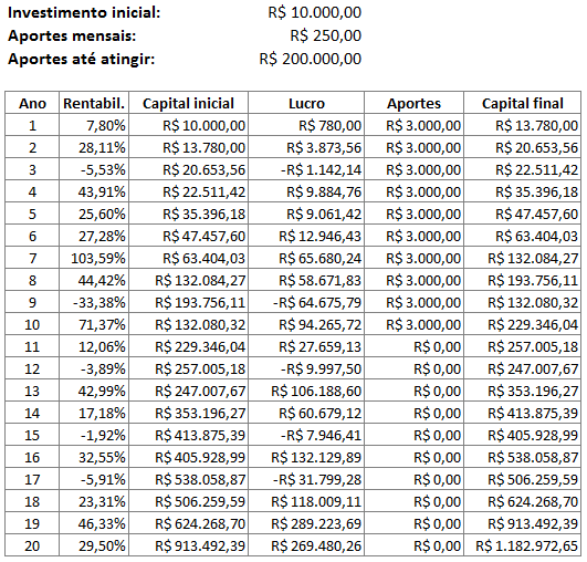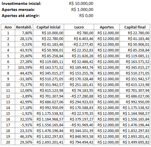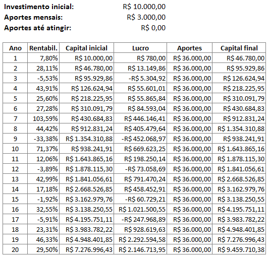 Para não inventar números de rentabilidades anuais quaisquer, vou pegar um fundo que teve uma boa performance, mas não a melhor, e usar a rentabilidade de 20 anos individualmente (1999 a 2018), trocando a ordem desses anos de forma aleatória. Ou seja, são rentabilidades reais que um investidor comprando ações por conta poderia ter tido. Não vou citar o fundo para não fazer propaganda, mas peguei um aleatoriamente. Se acessarem sites de fundos de ações e ver a rentabilidade histórica, verão que os percentuais abaixo são reais e não exagerados. Vou utilizar rentabilidades anuais para simplificar as contas. Para simplificar o assunto e os cálculos, não vou considerar a perda de poder de compra pela inflação no período. Também não vou considerar desconto de IR de 15% sobre o lucro. Podemos supor que a rentabilidade mensal/anual seja líquida, ou seja, a rentabilidade pode ter sido maior e já descontou IR. Ou ainda havia uma política de venda de até R$ 20 mil mensais no último dia útil do mês e recompra no dia seguinte onde os lucros seriam isentos de IR. Enfim, vamos para o que interessa.