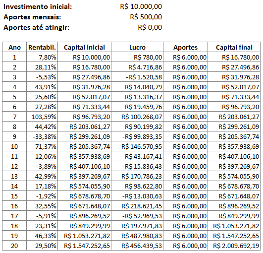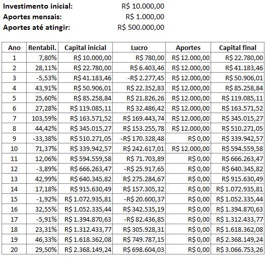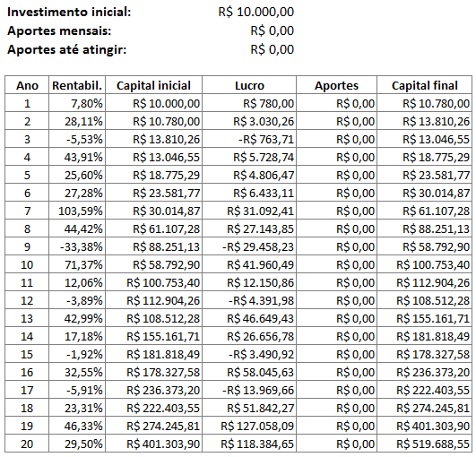 Nesse caso houve somente um investimento inicial e todo capital acumulado foi proveniente dos os lucros anuais. Depois de 20 anos, com um investimento inicial de apenas R$ 10 mil, o nosso amigo poderia ter acumulado R$ 519 mil, se tivesse tido as rentabilidades acima. Não chegou no R$ 1 milhão ainda, mas foi uma excelente caminhada, afinal foram só R$ 10 mil investidos! E com esse valor acumulado, ele precisaria de mais 92,5% para entrar na casa do milhão, o que poderia acontecer nos próximos poucos anos dependendo da rentabilidade.