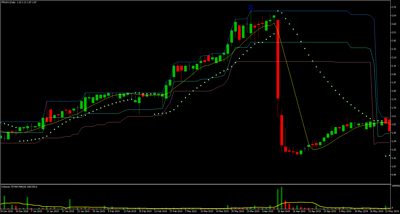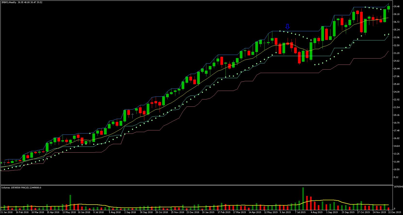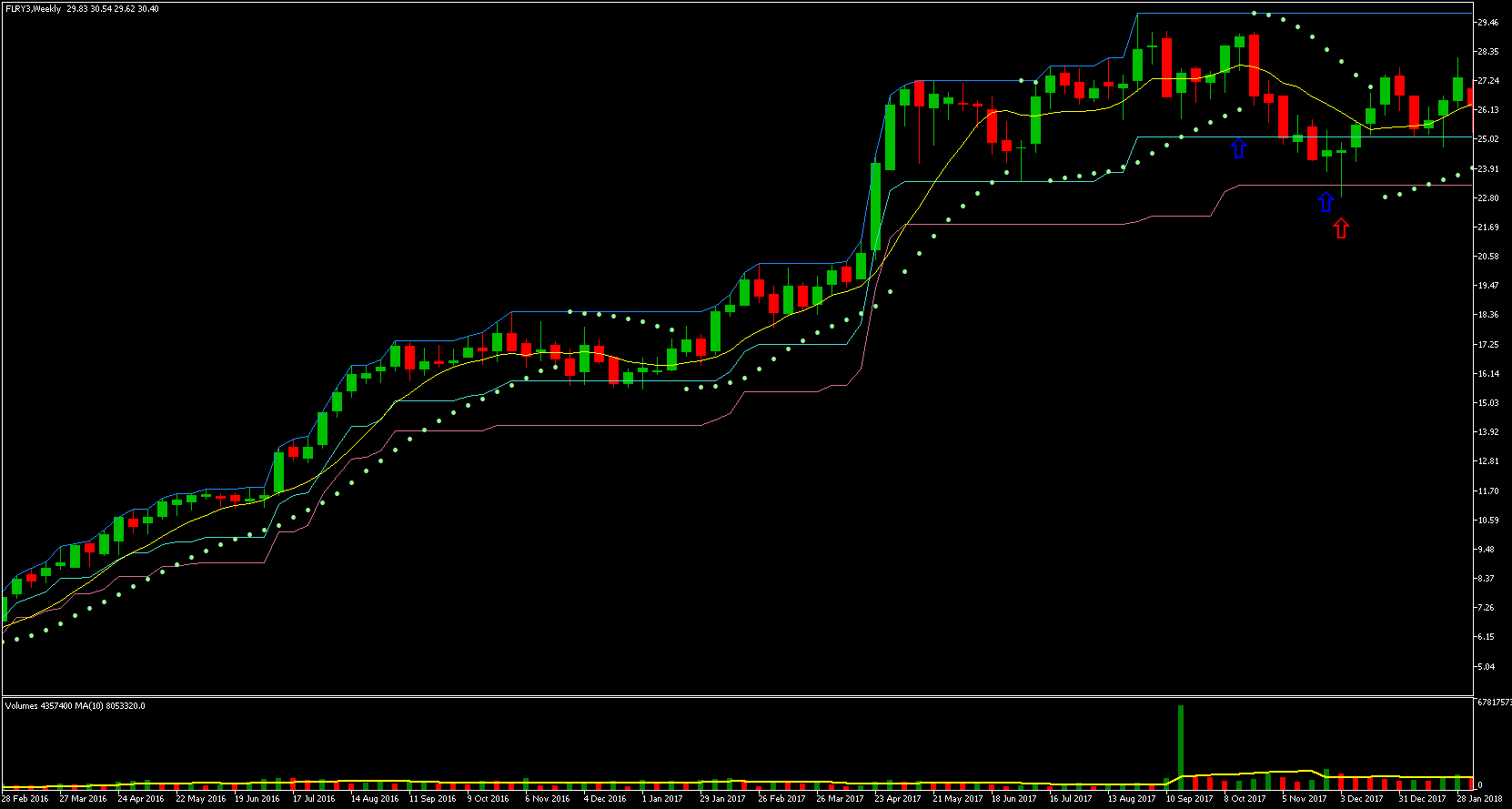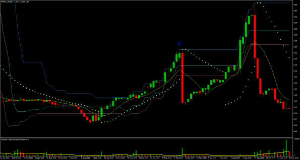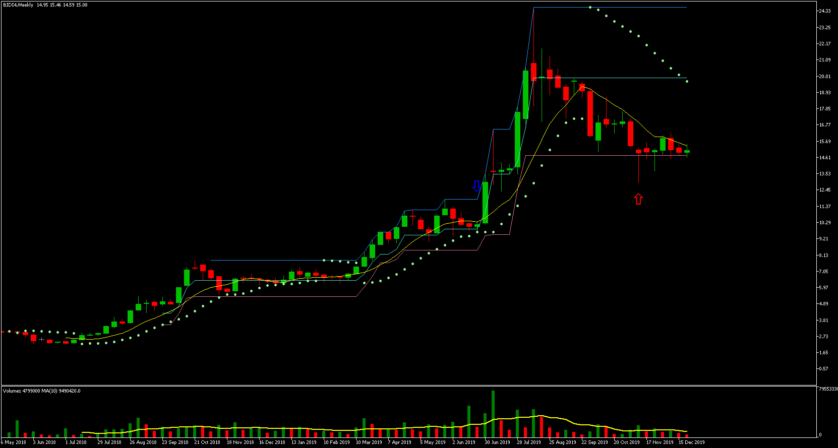 Podemos ver que o preço mais alto ocorreu em 21/05, a partir desse dia os preços começaram a cair. O preço mais baixo ocorreu no dia 21/11, ou seja, exatos 6 meses depois! Vejam que a queda foi gradativa durante todo esse período, caindo um percentual relativamente pequeno a cada dia com barra vermelha. Houve somente alguns dias de maior desespero dos investidores e quedas relativamente maiores.