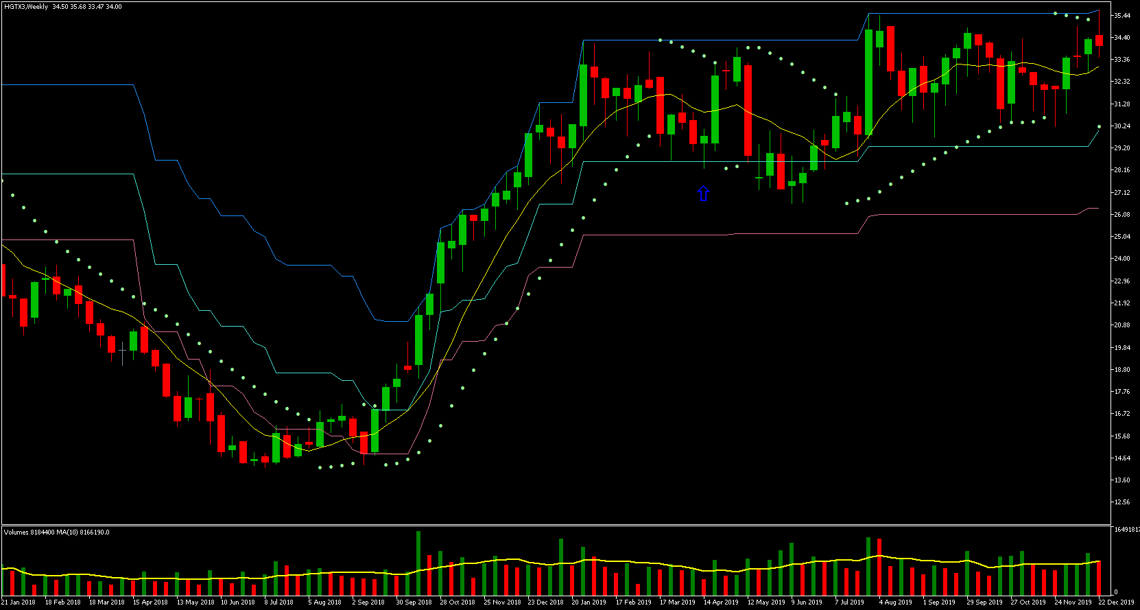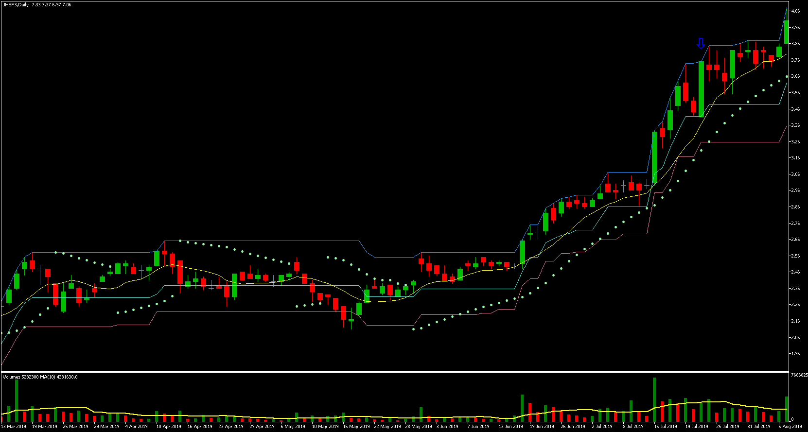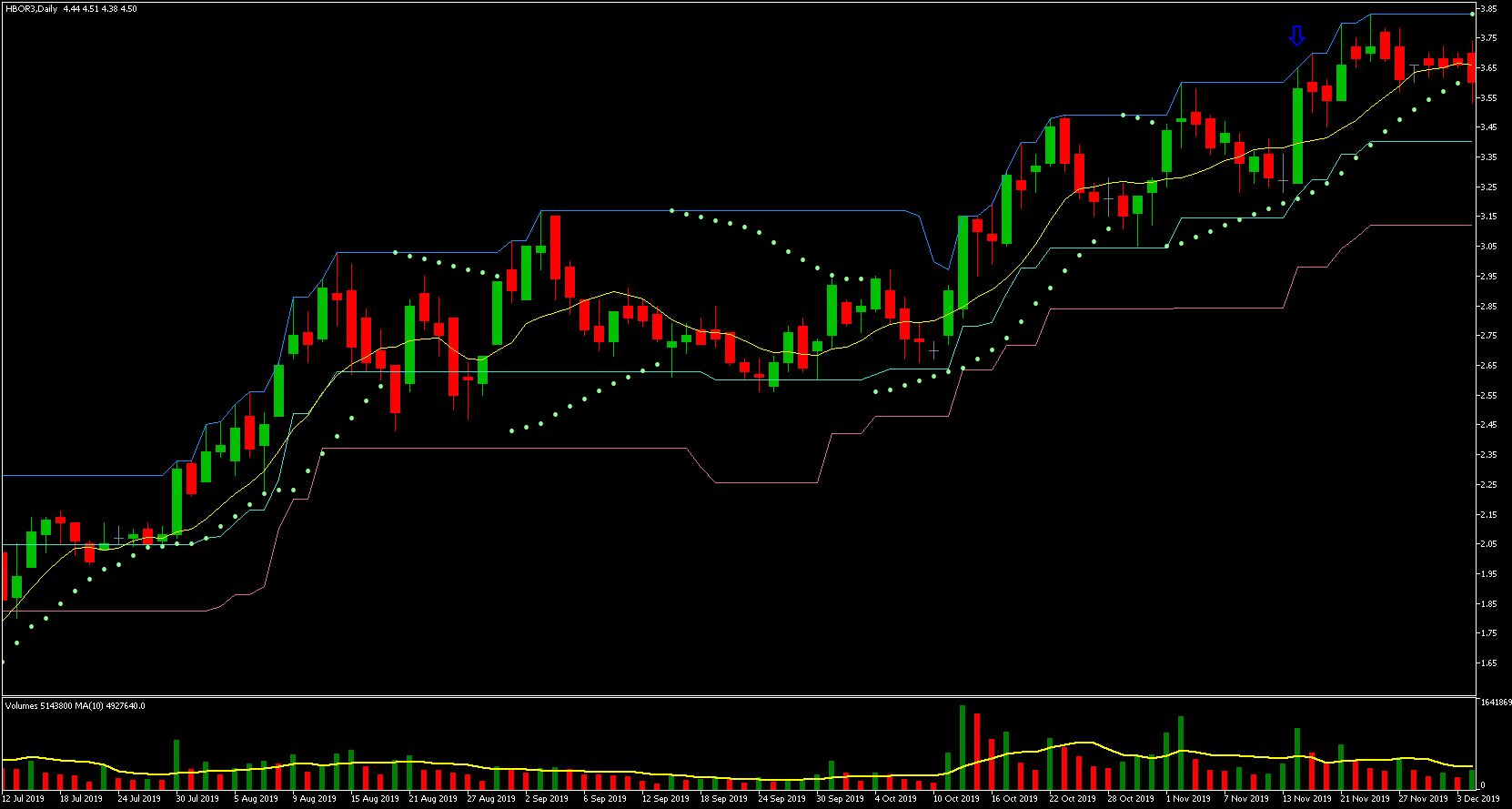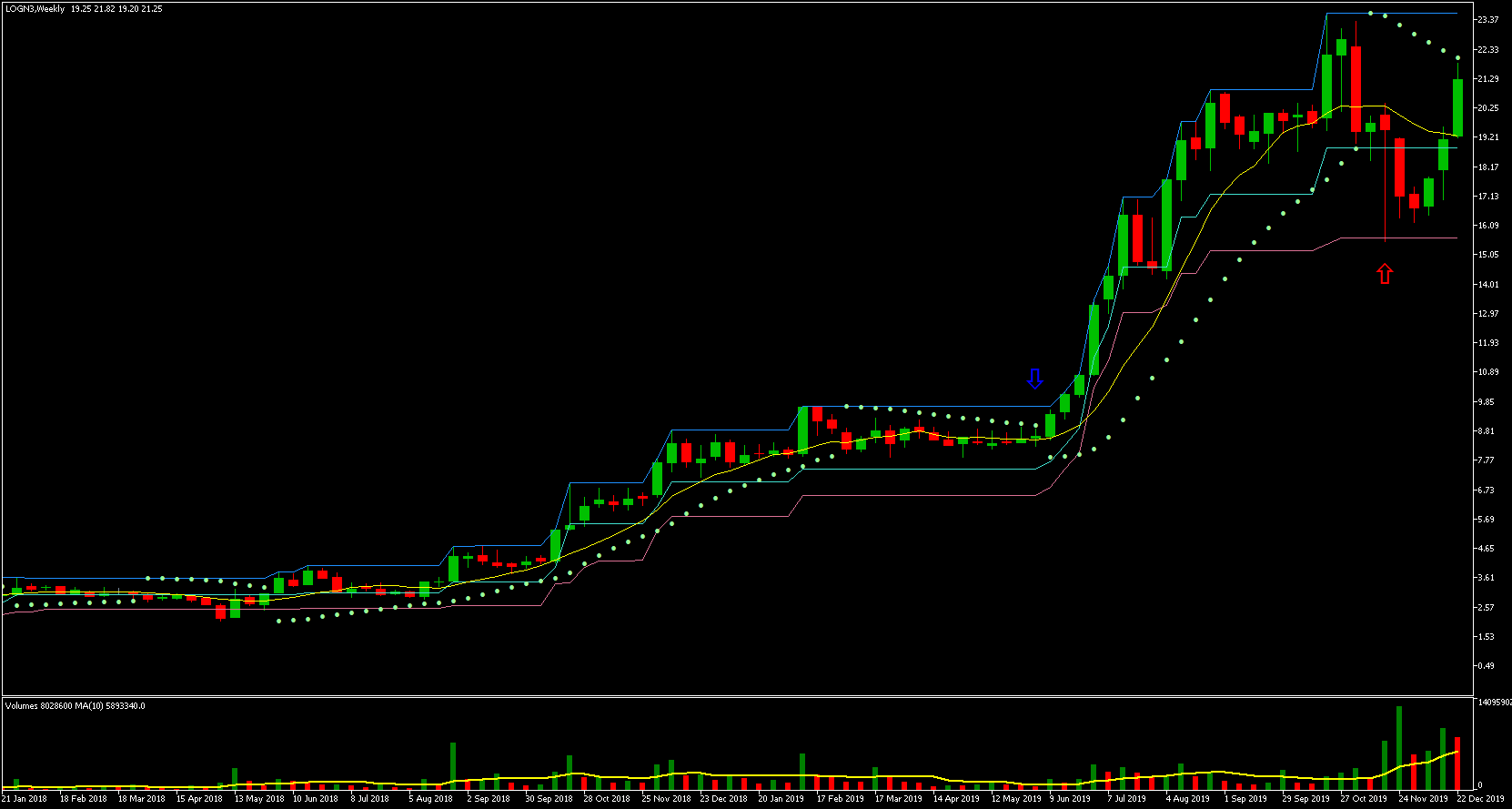 Podemos ver que o preço mais alto ocorreu em 21/05, a partir desse dia os preços começaram a cair. O preço mais baixo ocorreu no dia 21/11, ou seja, exatos 6 meses depois! Vejam que a queda foi gradativa durante todo esse período, caindo um percentual relativamente pequeno a cada dia com barra vermelha. Houve somente alguns dias de maior desespero dos investidores e quedas relativamente maiores.