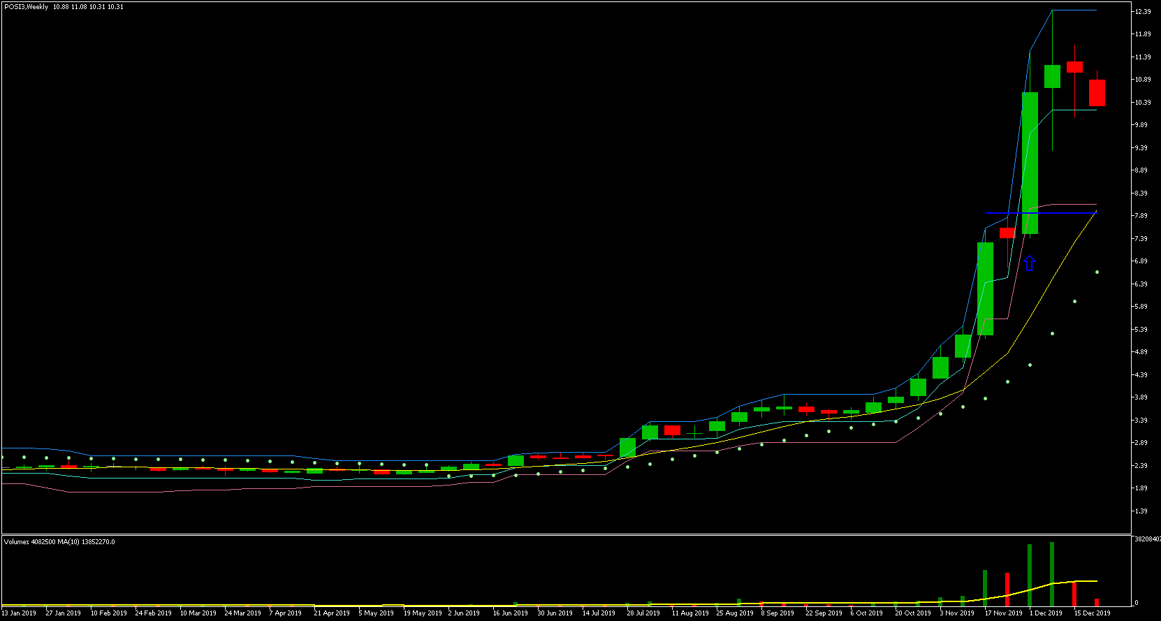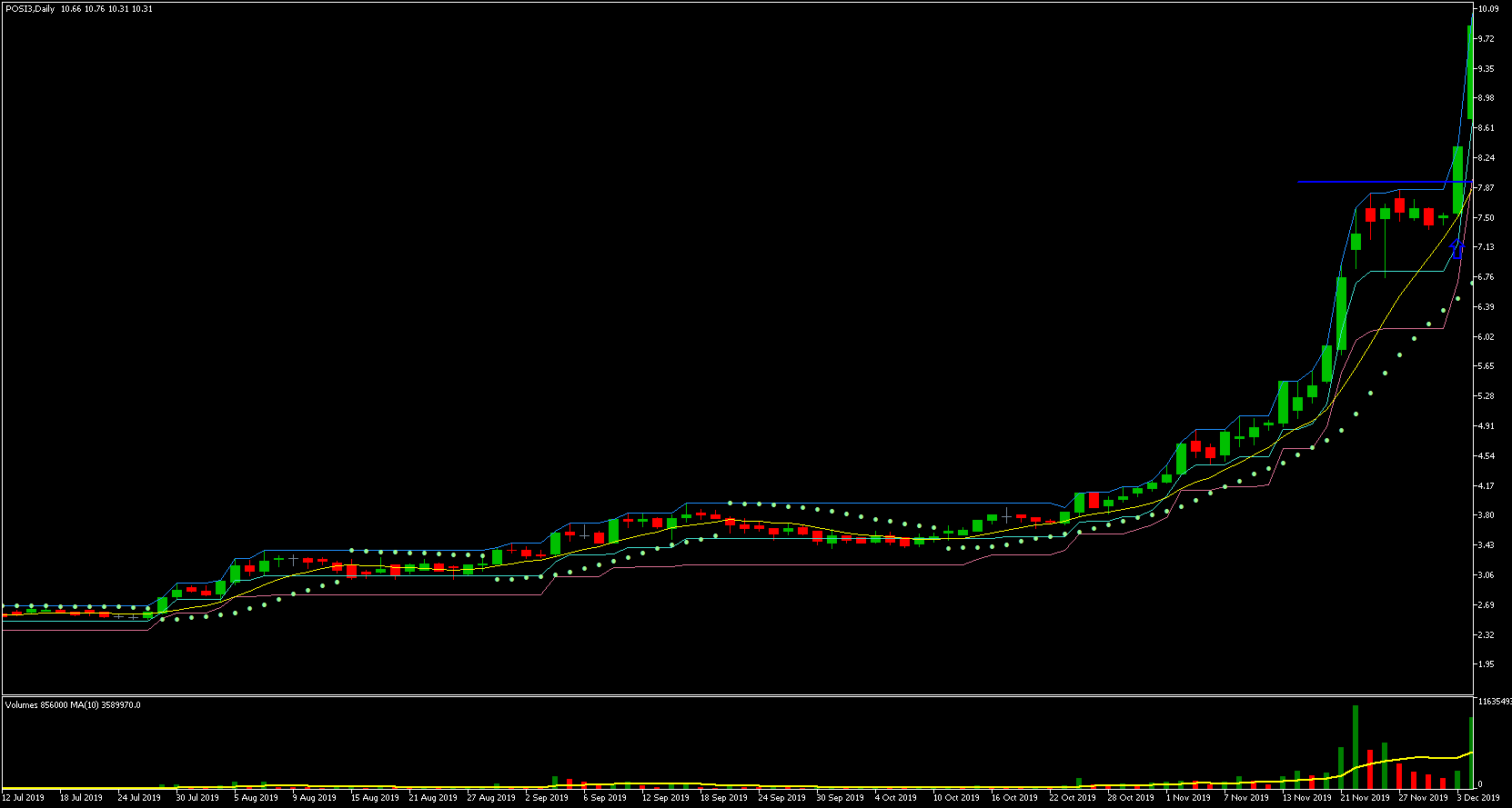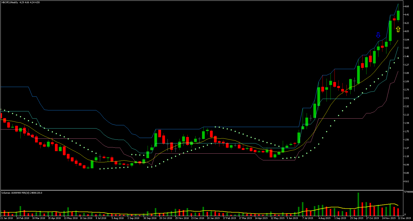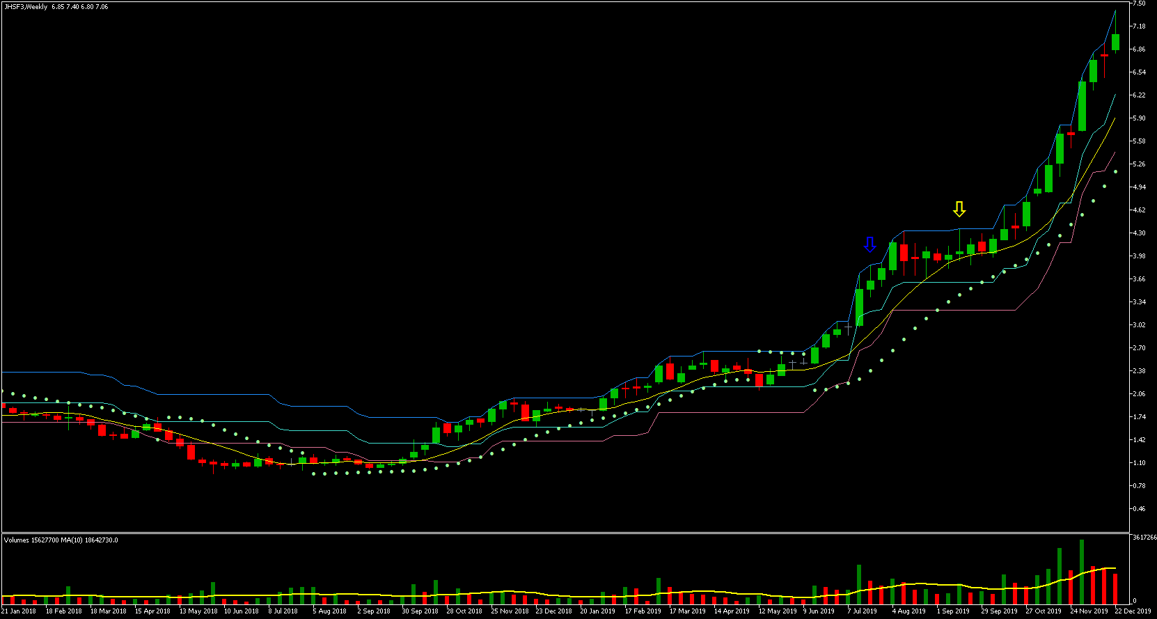 Podemos ver que o preço mais alto ocorreu em 21/05, a partir desse dia os preços começaram a cair. O preço mais baixo ocorreu no dia 21/11, ou seja, exatos 6 meses depois! Vejam que a queda foi gradativa durante todo esse período, caindo um percentual relativamente pequeno a cada dia com barra vermelha. Houve somente alguns dias de maior desespero dos investidores e quedas relativamente maiores.