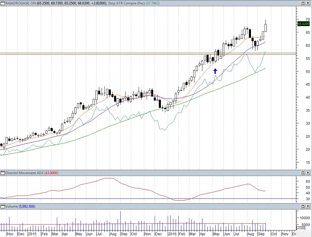 Abaixo é um exemplo de um stop móvel extremamente bem colocado. É o gráfico da minha posição em RADL3, a seta azul foi onde eu comprei, no ponto da linha verde horizontal. A linha azul clara oscilando abaixo dos preços é o nível do stop ATR. A linha vermelha horizontal é onde estava meu stop até sexta-feira. Em agosto os preços fizeram uma correção de 3-4 semanas e em setembro voltaram a subir, e agora vou aumentar o stop, passando do meu ponto de entrada. O stop ficou bem abaixo de onde os preços passaram, considerando que se caíssem mais haveria maiores chances de reversão, portanto seria mais prudente sair da operação.