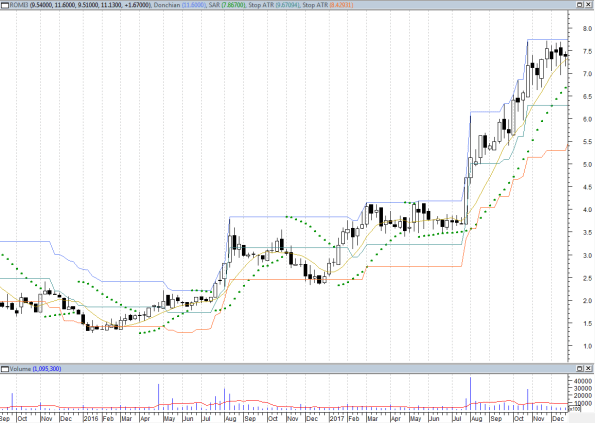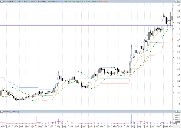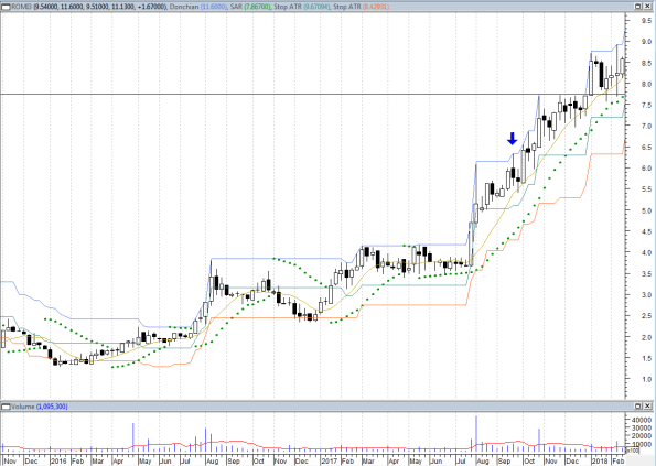 Eu sou muito simplista, sistêmico e direto ao ponto. O objetivo da minha estratégia é de seguir a tendência (trend following) o maior tempo possível e não sair até que a ação me diga para sair, segundo minhas regras. Apesar de 25% ser um ótimo lucro, eu busco rentabilidade bem maiores, de preferência acima de 100% quando possível. Por isso eu sou resistente a vender na subida, em congestões (mesmo que OBV ou similar estiver caindo) ou em correções de média amplitude (15-20%). Sempre permaneço acreditando que a ação possa continuar subindo mais e mais, até que ela me diga o contrário.