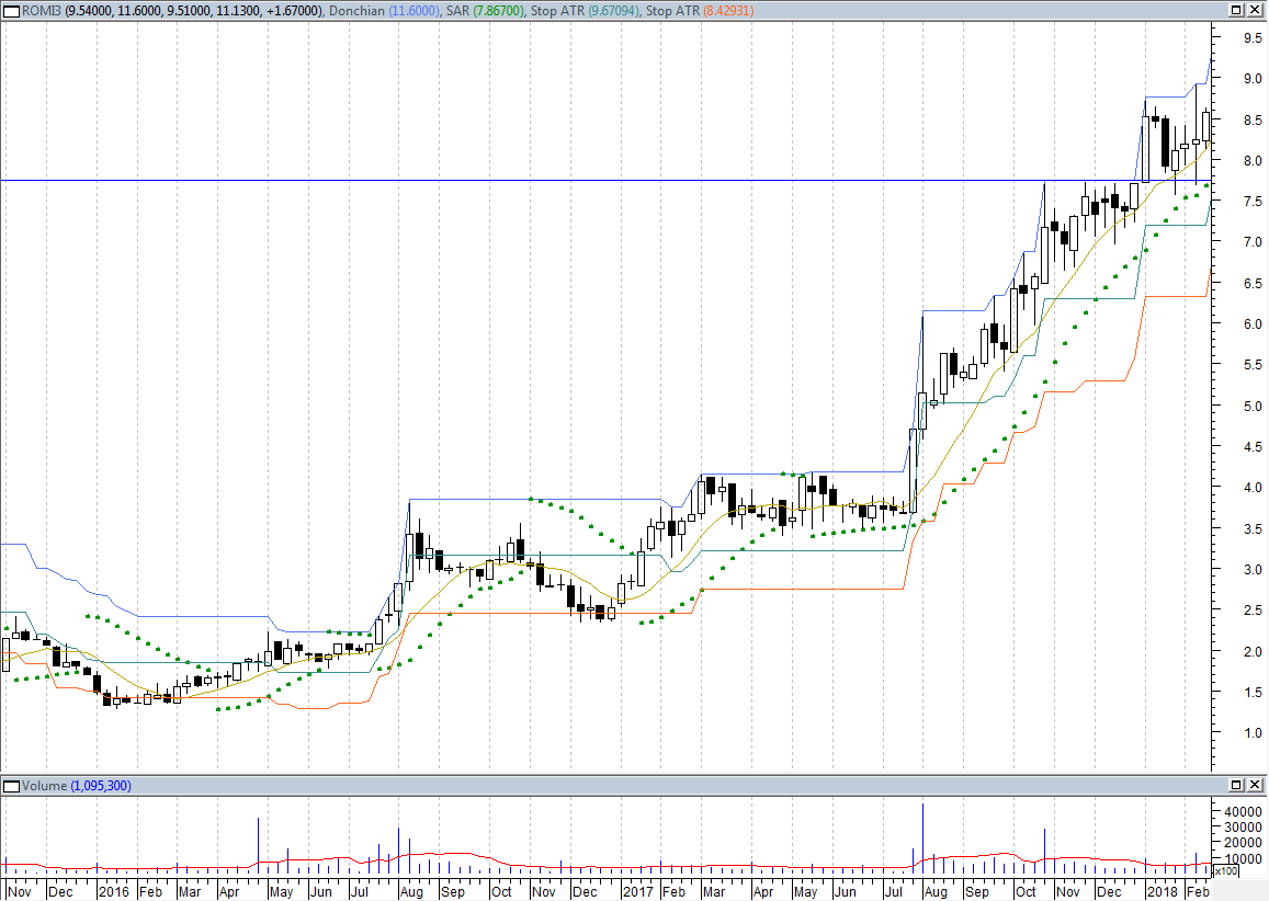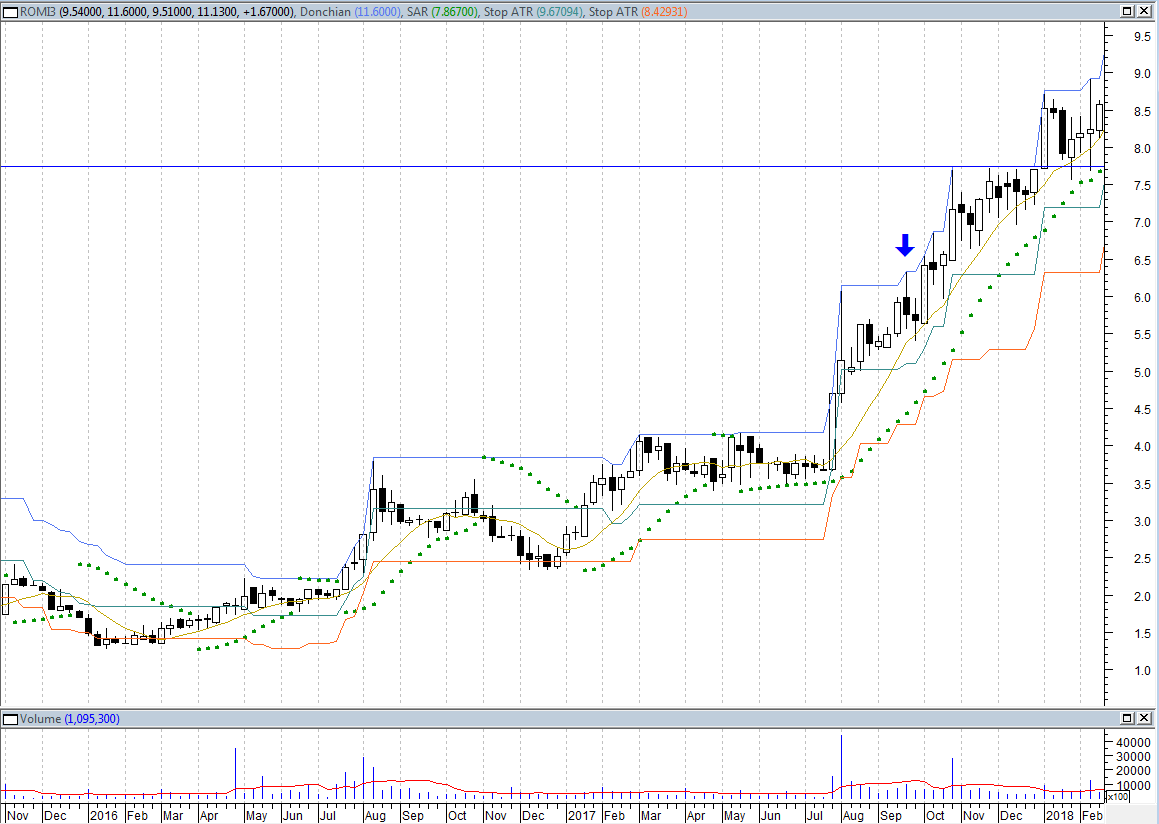 A primeira opção é esperar os preços recuarem até o preço de original de compra (7,75). É normal de uma vez acontecido o rompimento os preços recuarem e tocarem na resistência novamente, que acaba virando um suporte. Nesse caso da ROMI3 acabou acontecendo 2 vezes nas próximas semanas (linha horizontal azul):