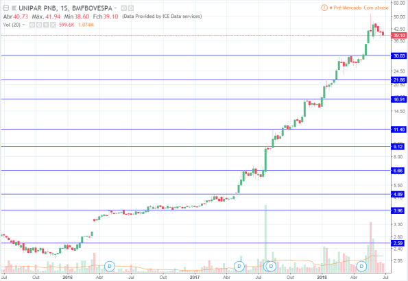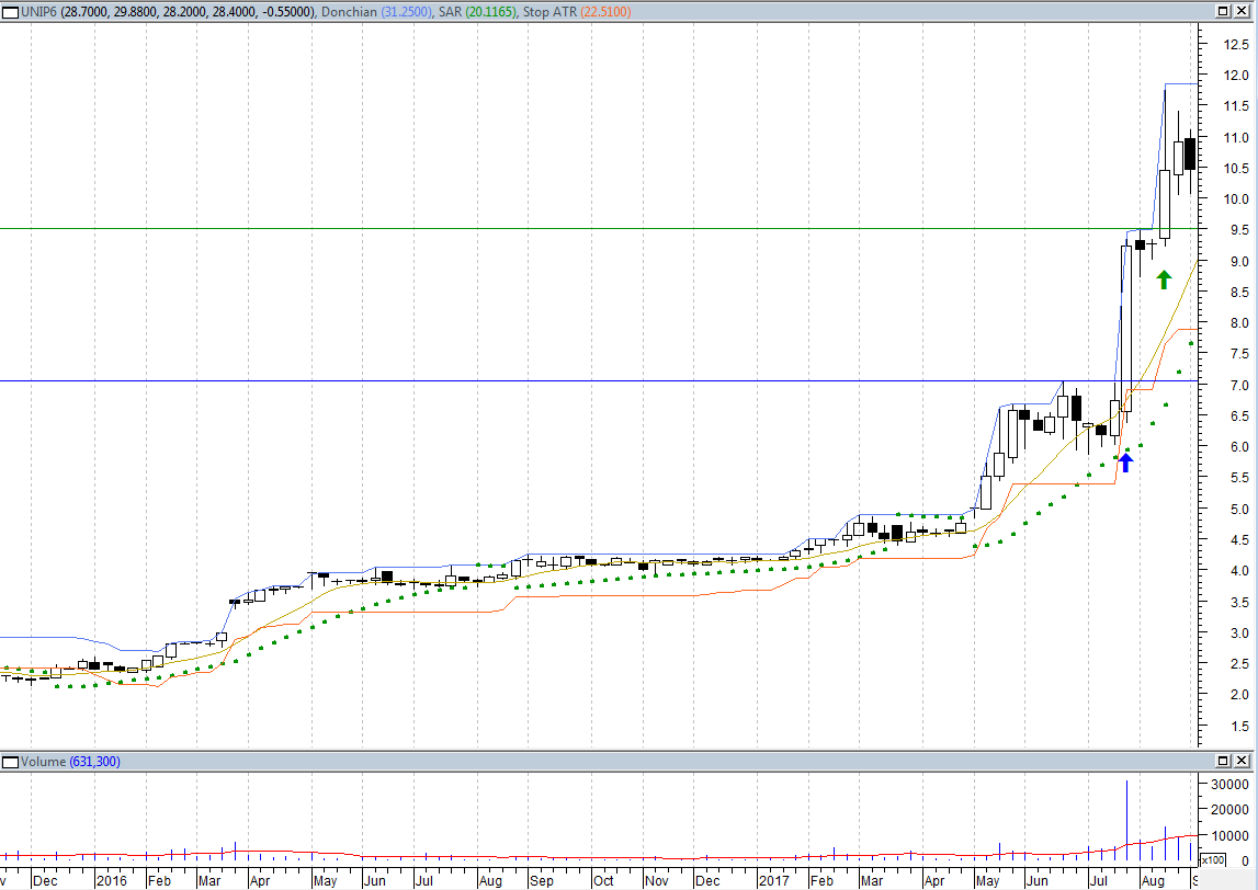 É o caso que aconteceu em UNIP6 em julho/2017 conforme gráfico abaixo. Caso fosse perdido a entrada do rompimento da resistência da linha azul, onde teria ocorrido na seta azul, não daria para entrar conforme nenhuma das opções anteriores, pois na semana do rompimento a ação subiu 37%! Nesse caso eu teria esperado uma nova correção, que aconteceu bem leve 2 semanas depois, formando uma nova resistência na linha verde, e eu poderia comprar no seu rompimento, que teria ocorrido na seta verde.