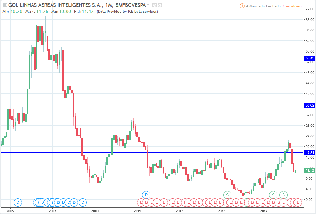 O topo da GOLL4 foi em 05/2006 a R$71,25. O valor atual é de R$11,12.