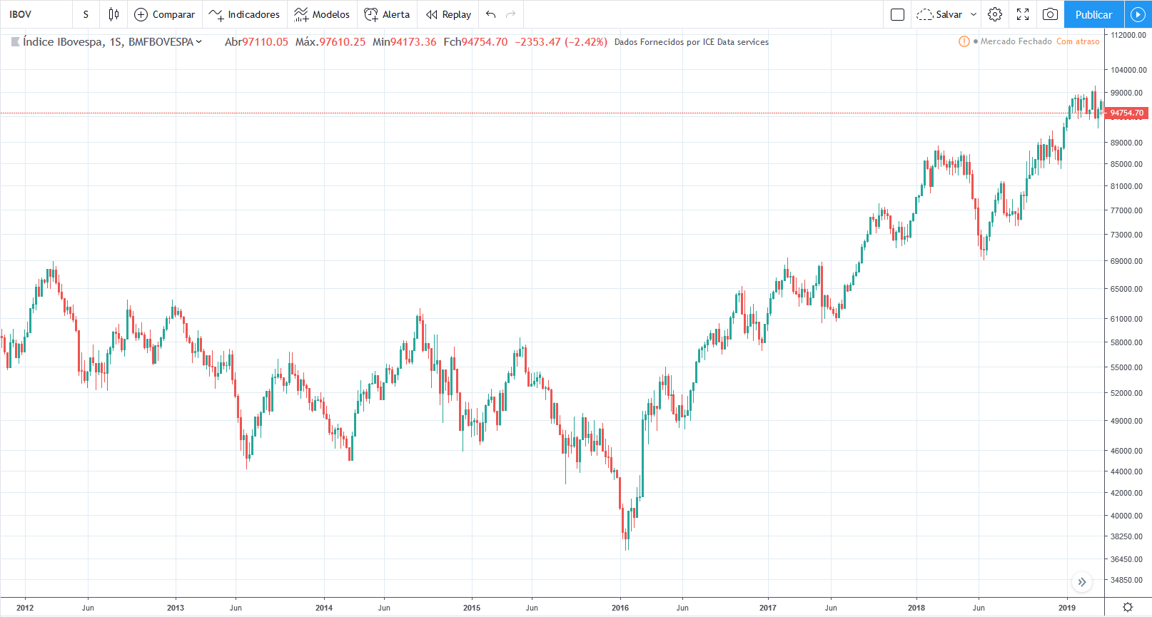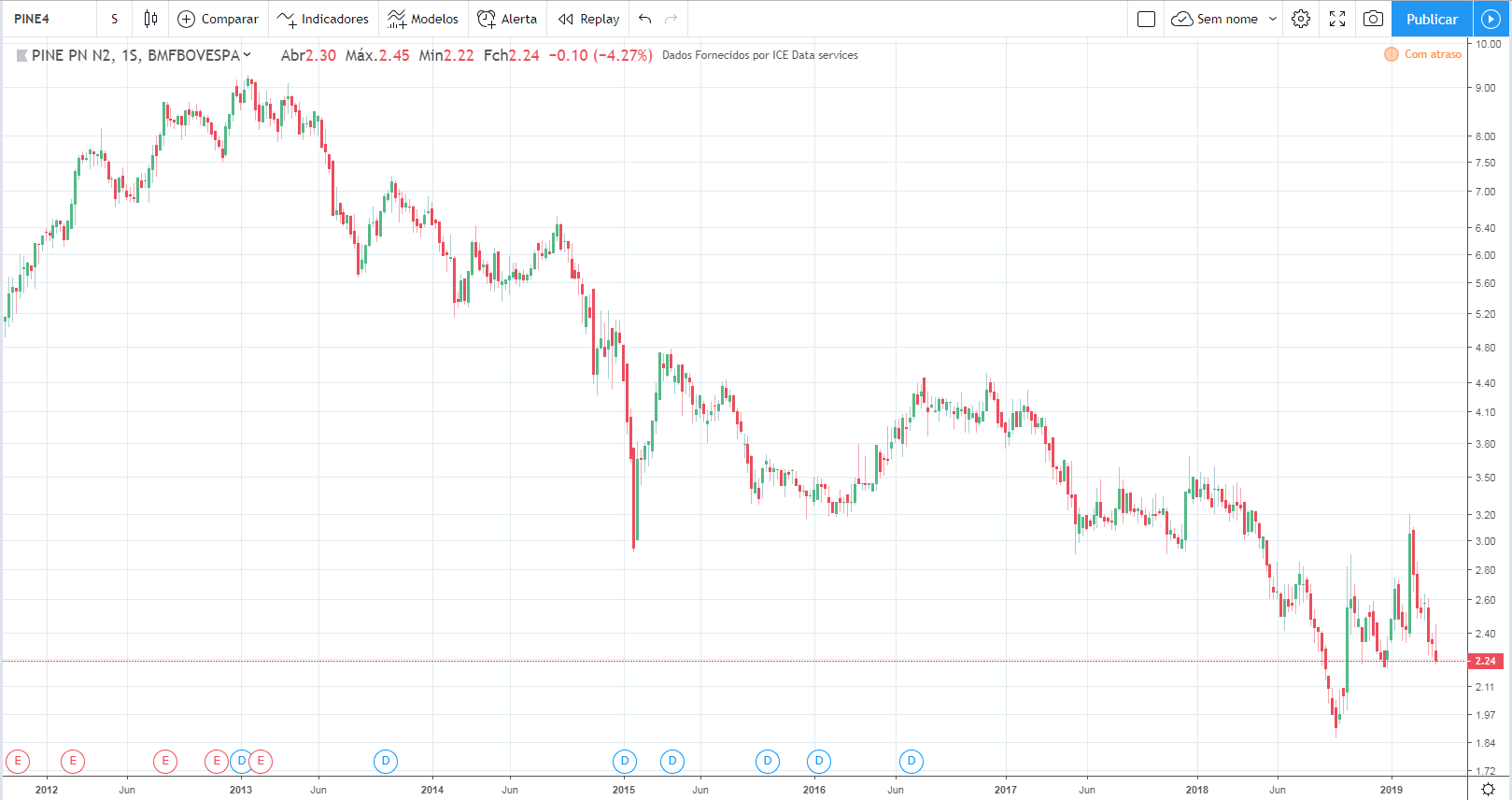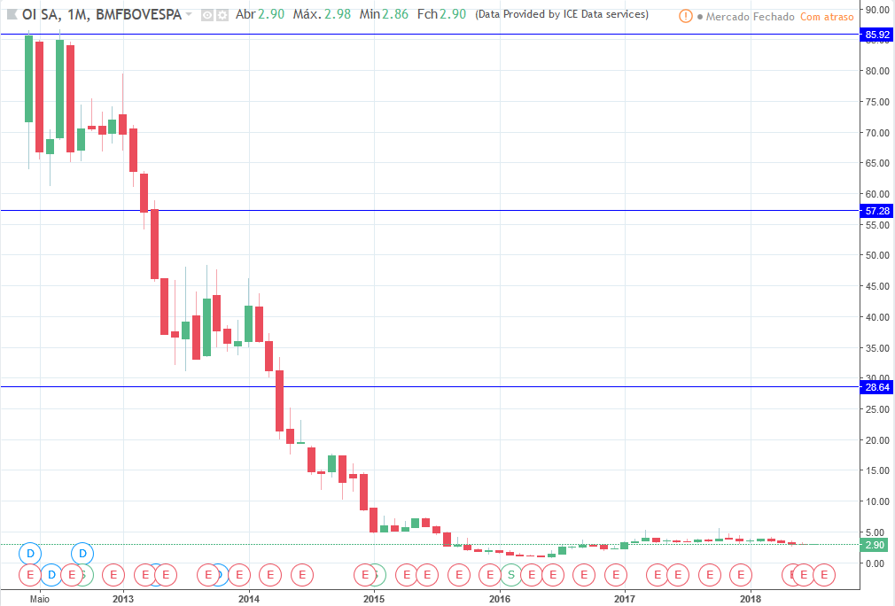 O topo da OIBR4 foi em 12/2009 a R$114,56 (não disponível nesse gráfico do TradingView. O valor atual é de R$2,90.