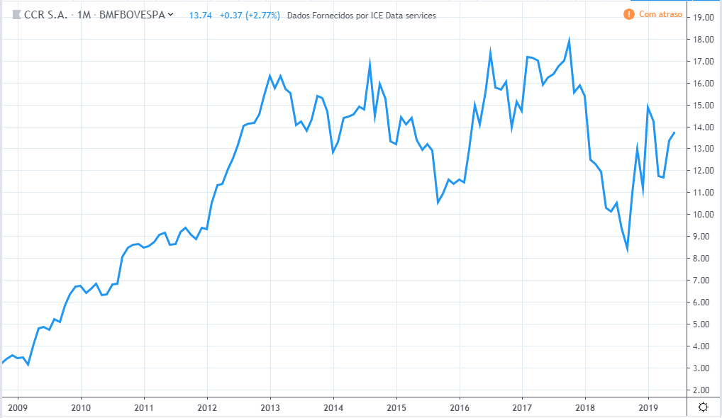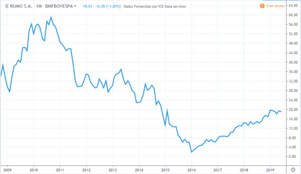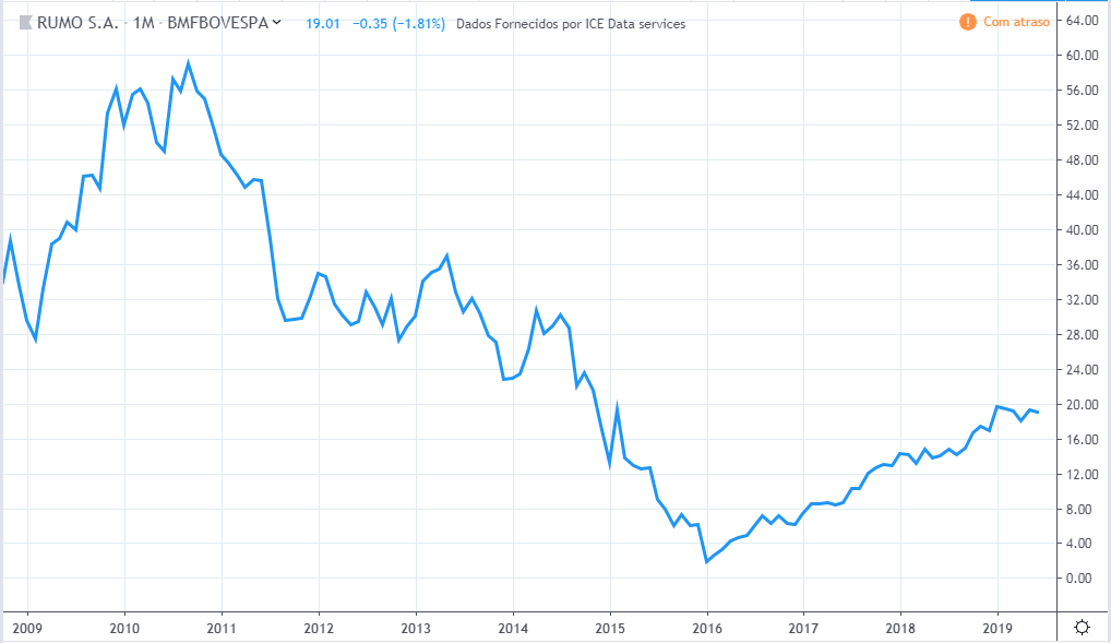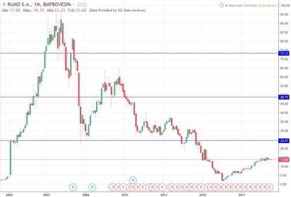 O topo da RAIL3 foi em 07/2007 a R$97,50. O valor atual é de R$13,69.