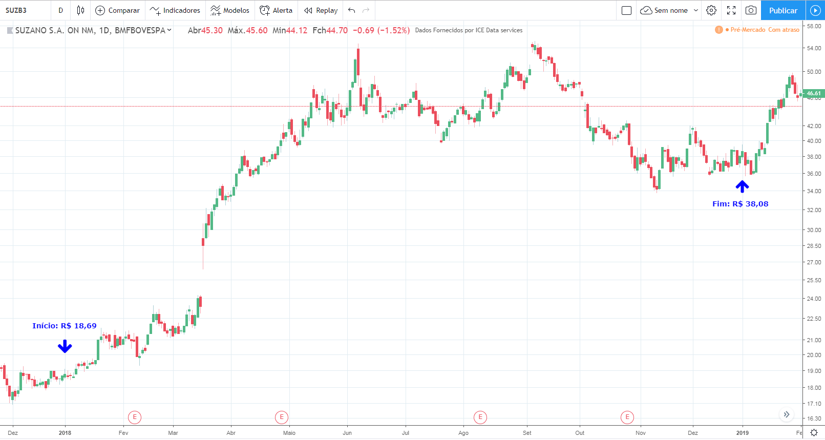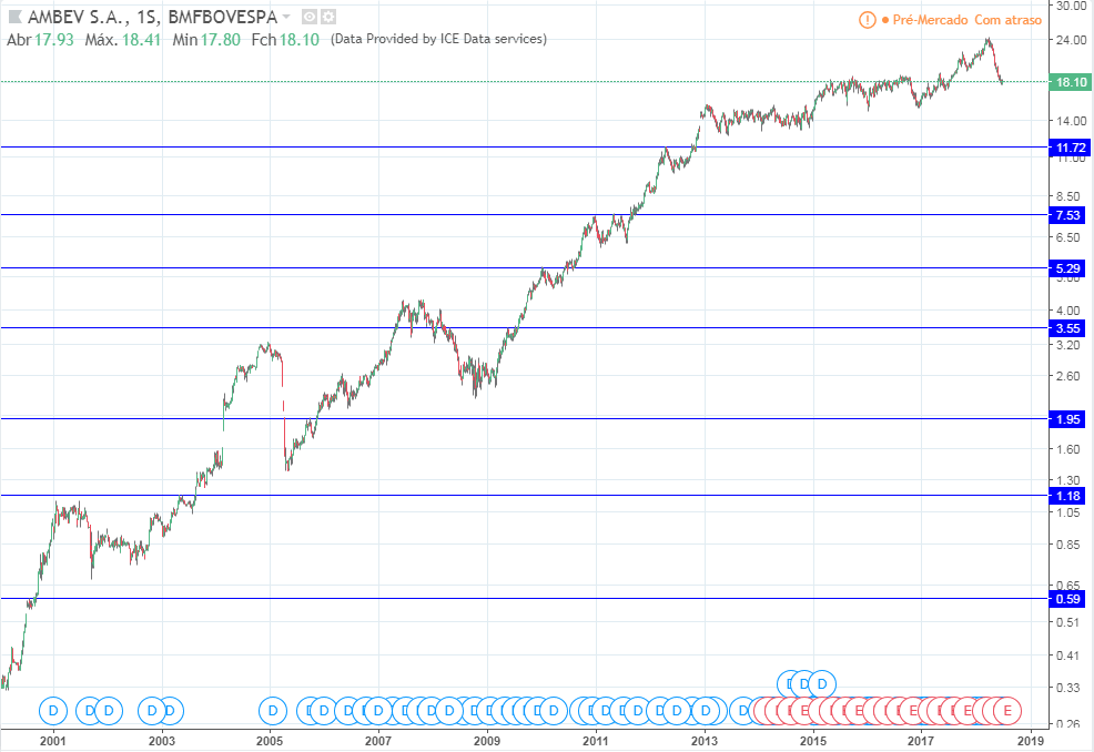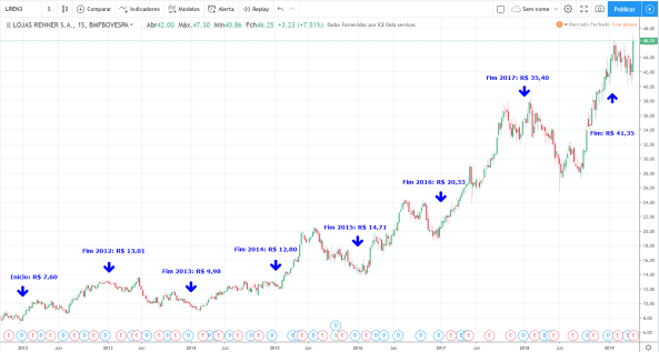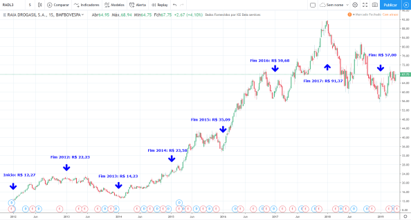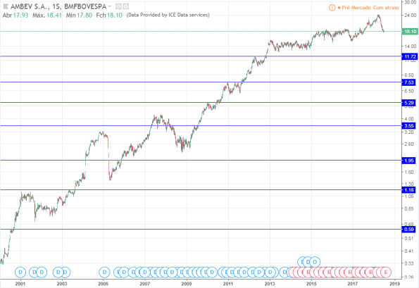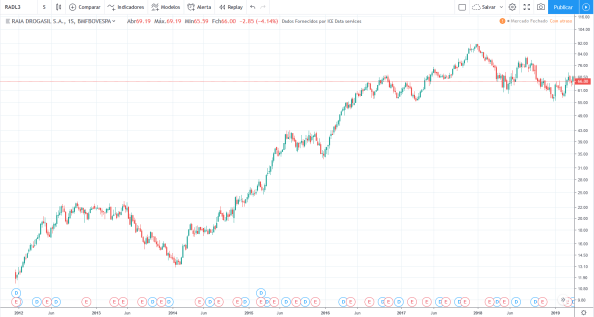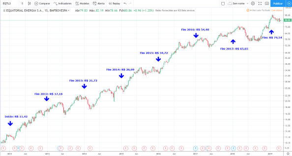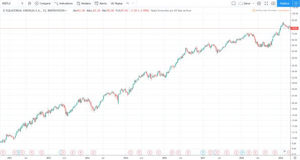 Até 2013 o lucro e os preços subiram. De 2014 a 2016 o lucro caiu fortemente porém os preços continuaram a subir. Em 2017 e 2018 o lucro voltou a subir forte e os preços entraram em lateralização.