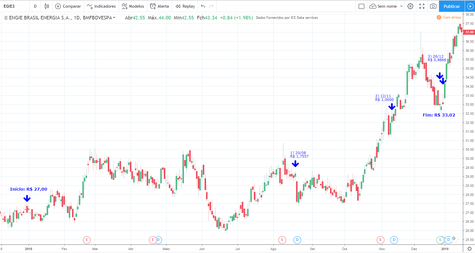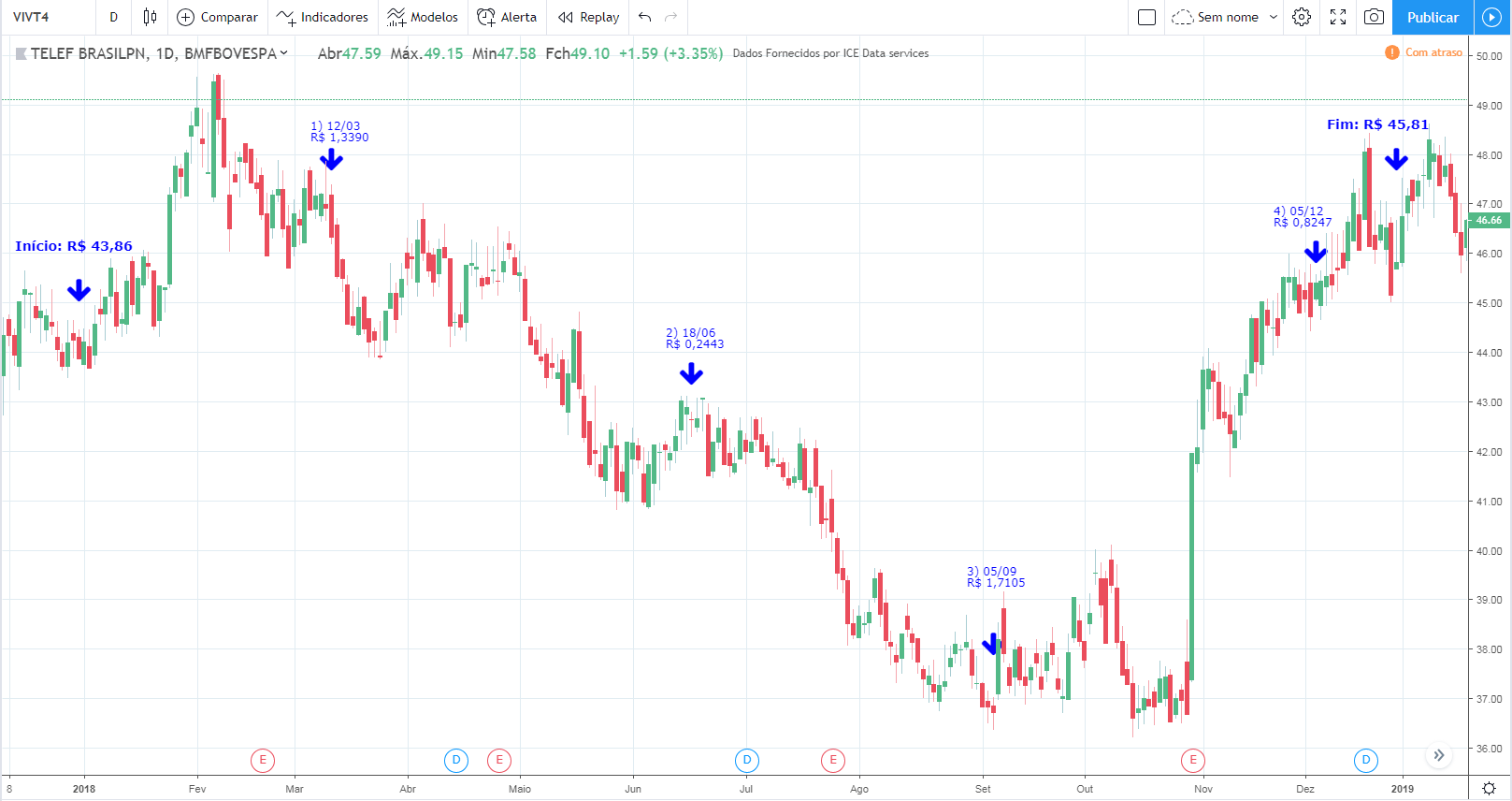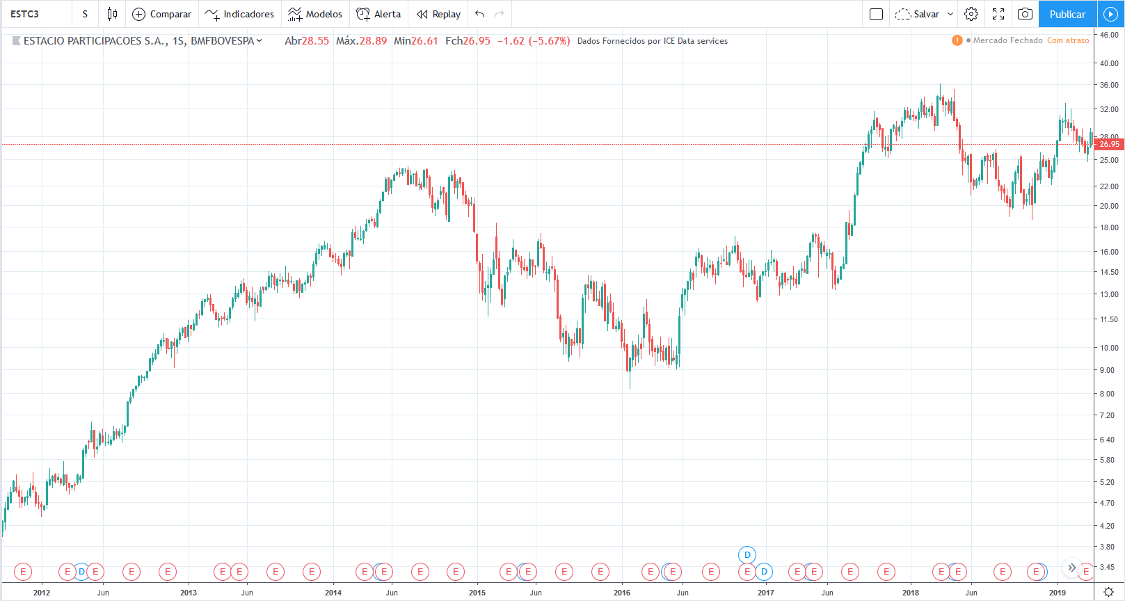 Ou seja, essa foi uma típica ação que comprando na queda teria resultado em desastre total. Conheço algumas pessoas que fizeram isso, compraram sem stop, hoje praticamente perderam tudo o investido.