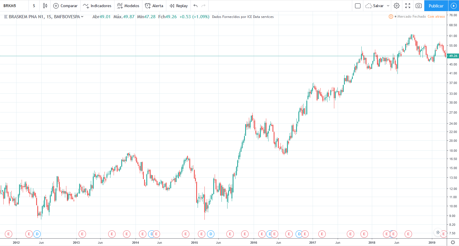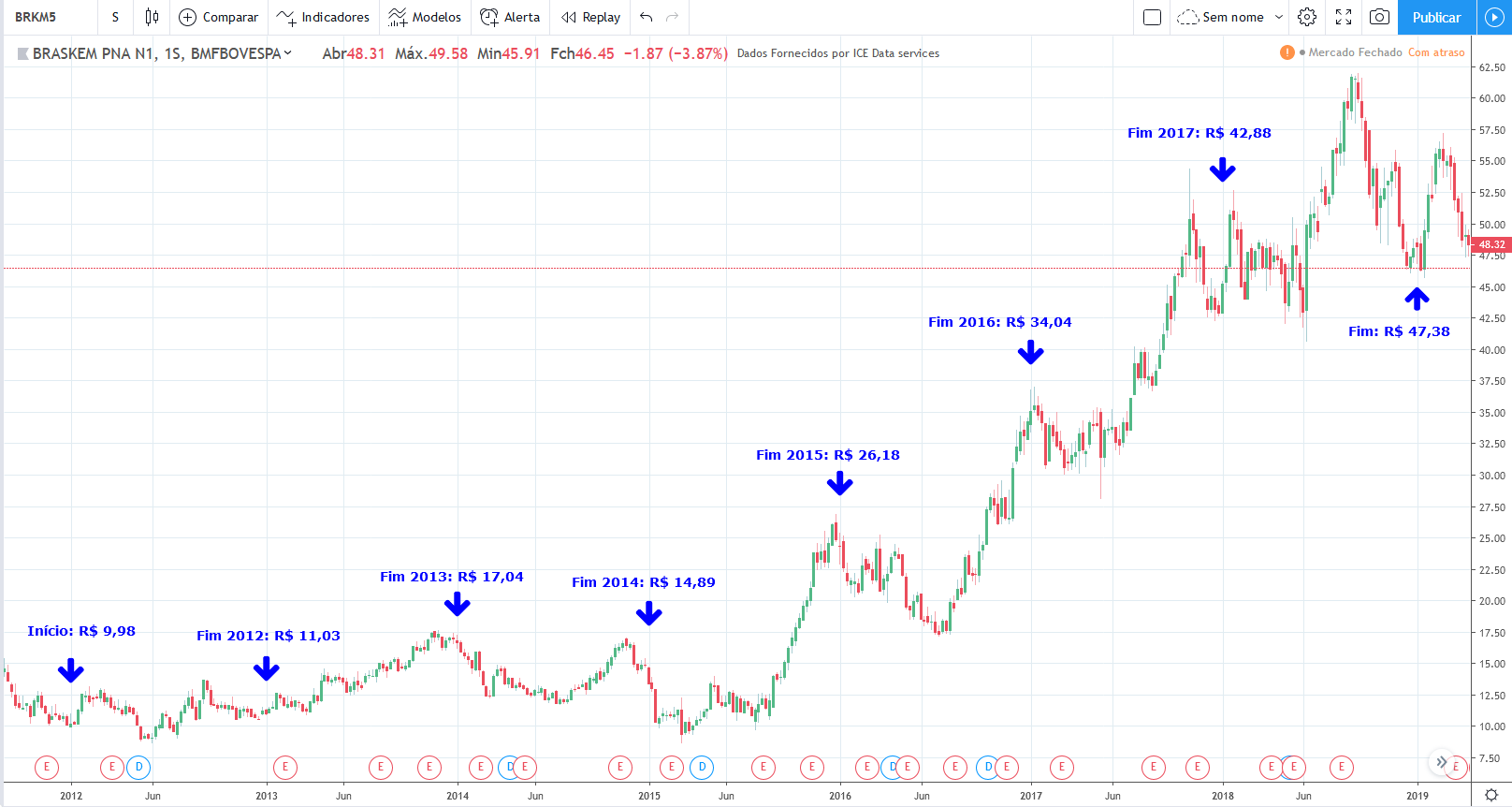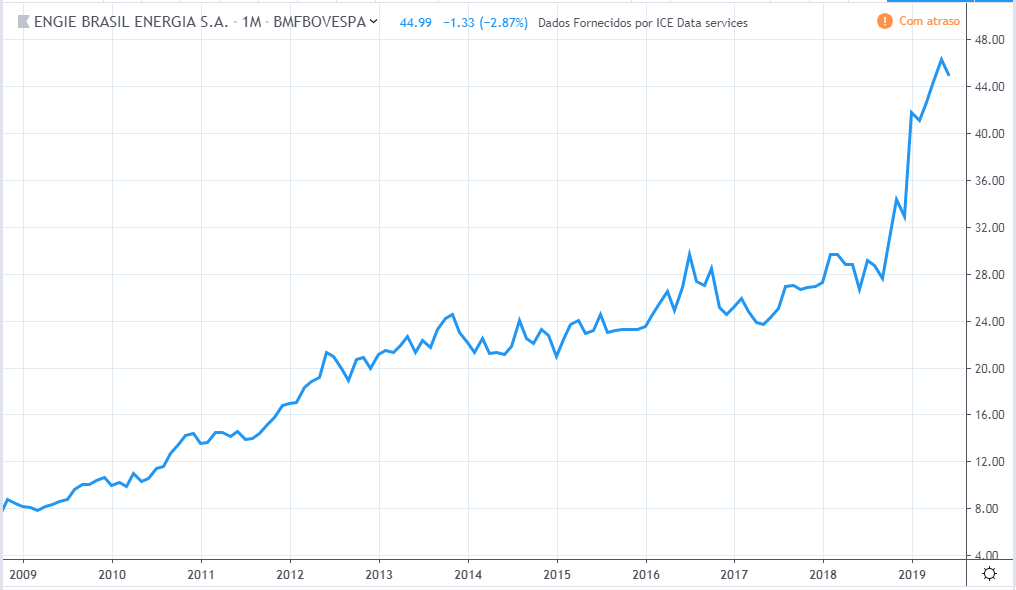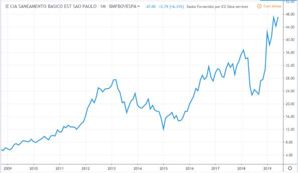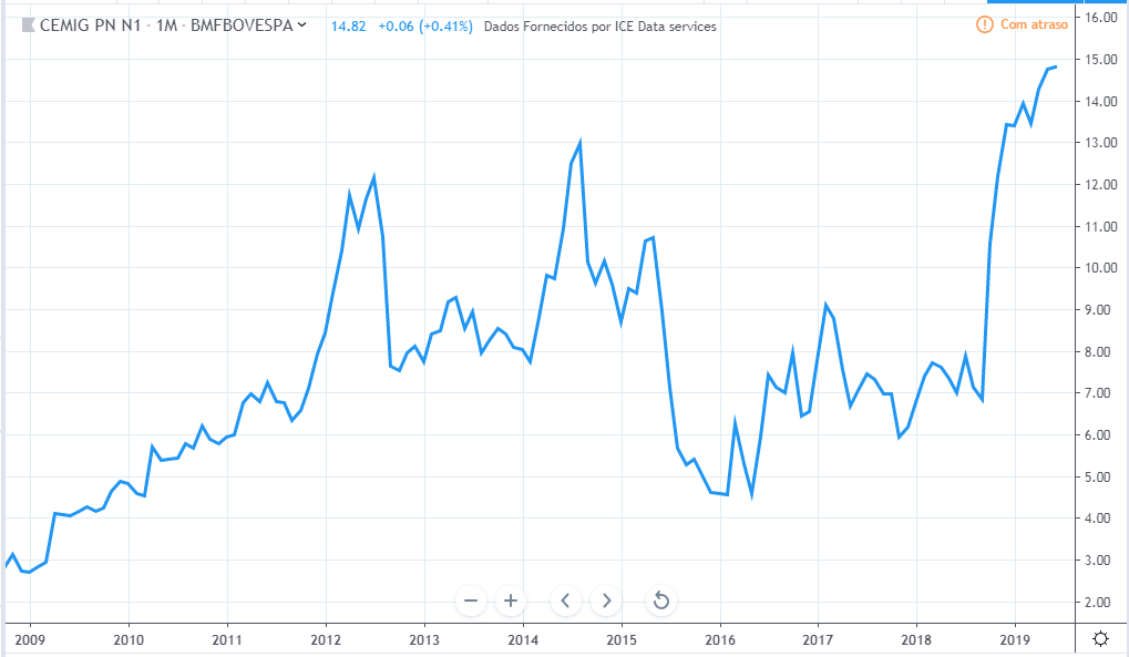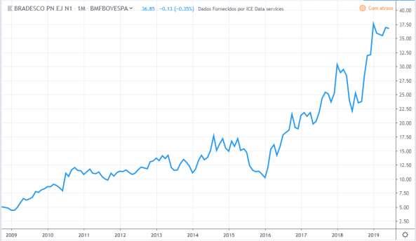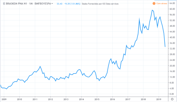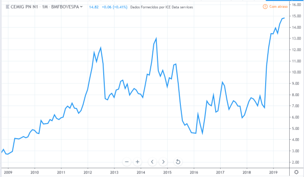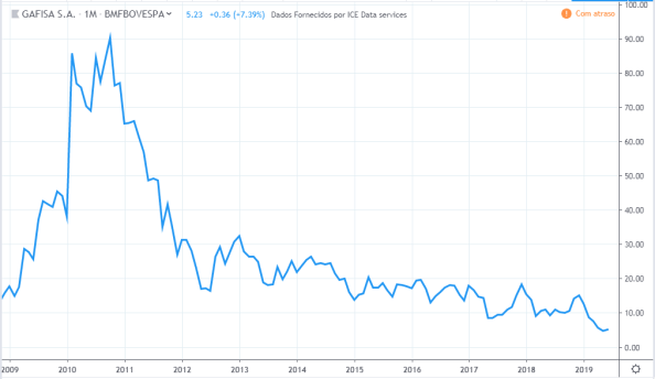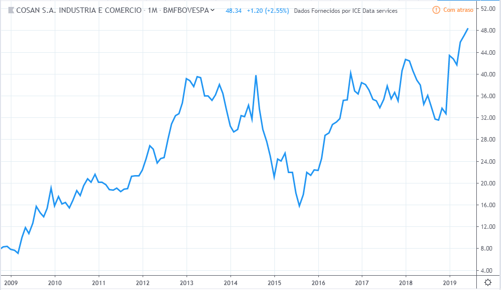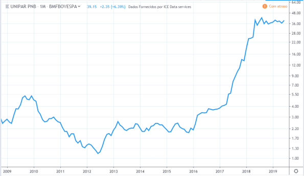 Tirando o forte aumento e depois queda do lucro em 2011 e 2012, o lucro ficou estagnado durante todo período, o valor atual está na mesma faixa que estava em 2010. Já os preços tiveram uma forte queda entre 2013 e 2015 mas no período geral fez um forte aumento de valor, saindo de R$8 para R$ 48 em 2019.