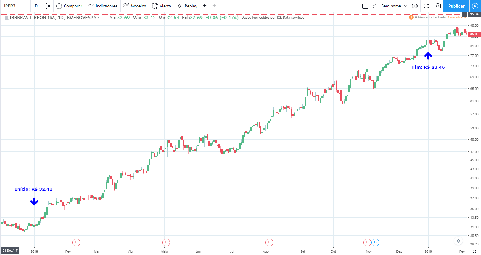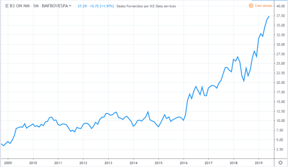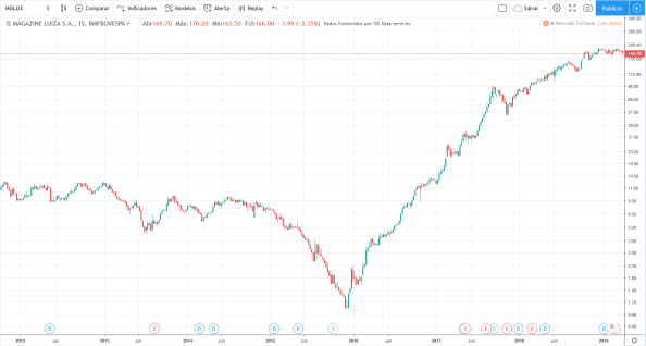 Na sequência colocarei gráficos de várias empresas, o primeiro com o preço da ação (fonte: Tradingview) e o segundo com o lucro da empresa (fonte dos dados: Fundamentus). Dividi em 3 categorias conforme explicado acima.