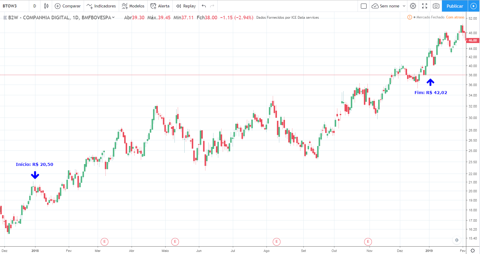 O lucro ficou estagnado até 2015 e o preço também, subindo muito levemente. Em 2016 o lucro aumentou fortemente e os preços começaram a subir. Ainda em 2016 o lucro caiu fortemente porém os preços continuaram a subir rapidamente.