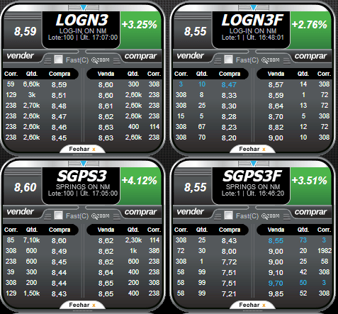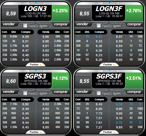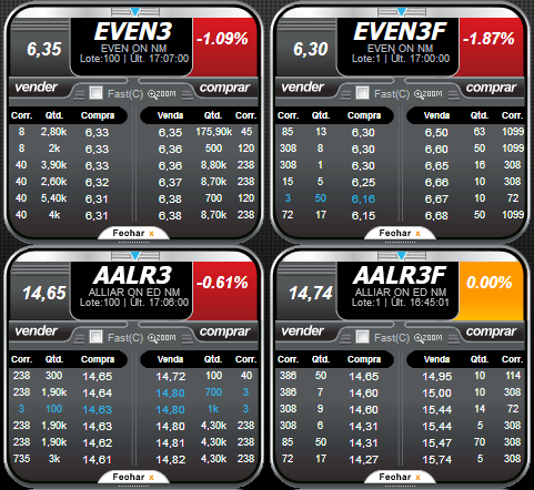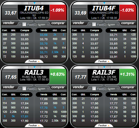 Nos 2 exemplos abaixos vemos que o spread é bem baixo, na casa dos 0,1%, tanto no lote padrão quanto no fracionário: