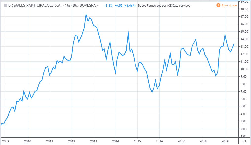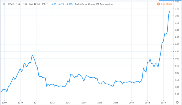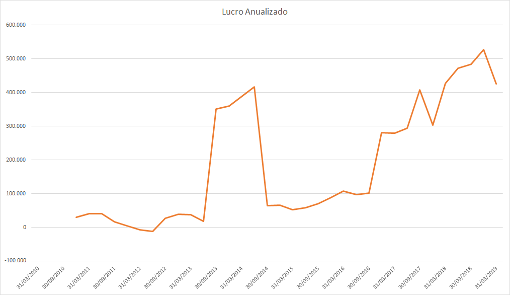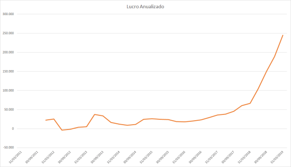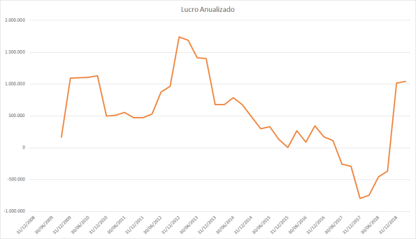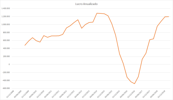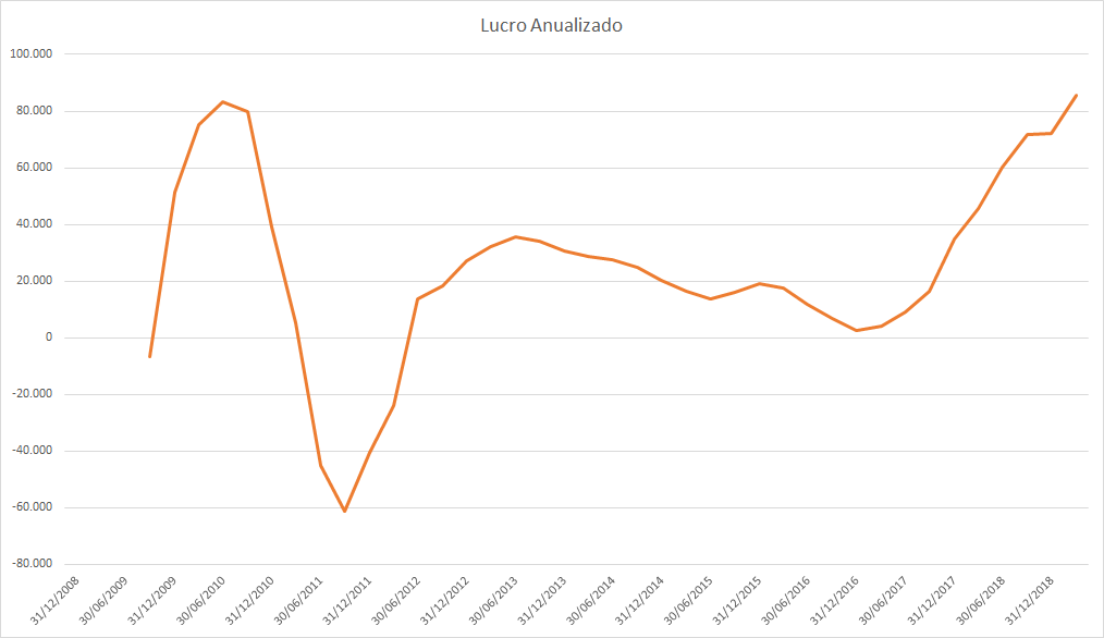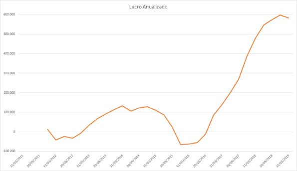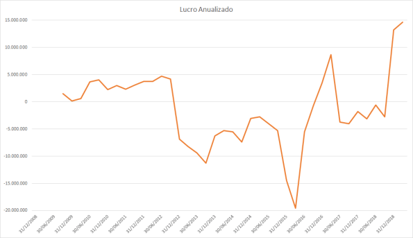 Até 2011 o lucro estava estagnado e os preços subindo fortemente. Em 2012 e 2013 tanto o lucro quanto o preço subiram, assim como a queda de 2014 a 2016. Em 2017 o lucro subiu fortemente porém o preço muito pouco, somente no mesmo patamar de antes. Do meio de 2018 até 2019 o lucro continuava uma queda forte porém os preços subiram quase dobrando o valor do fundo anterior.
