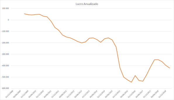 Lucro ficou estagnado até 2014 e os preços já despencavam. Em 2014 o lucro despencou ficando com muito prejuízo e o preço continuou a cair. De 2016 em diante os prejuízos foram diminuindo e a empresa entrou no lucro novamente, maior do que no passado, porém o preço da ação com apenas 1/3 do topo anterior em 2010.