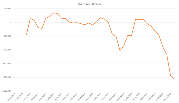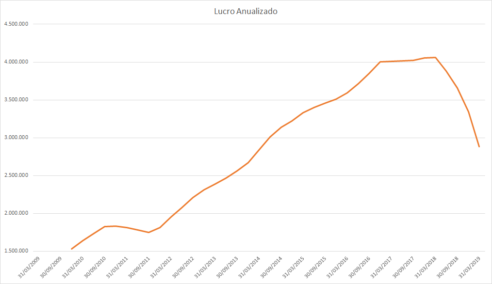 Lucro ficou praticamente estagnado de 2010 a 2019, tendo um bom aumento em 2016 que foi retornado em 2018. Durante todo esse período o preço da ação só caiu.