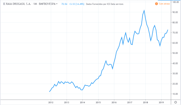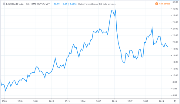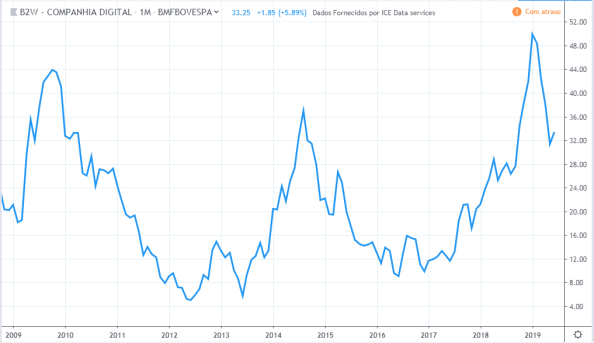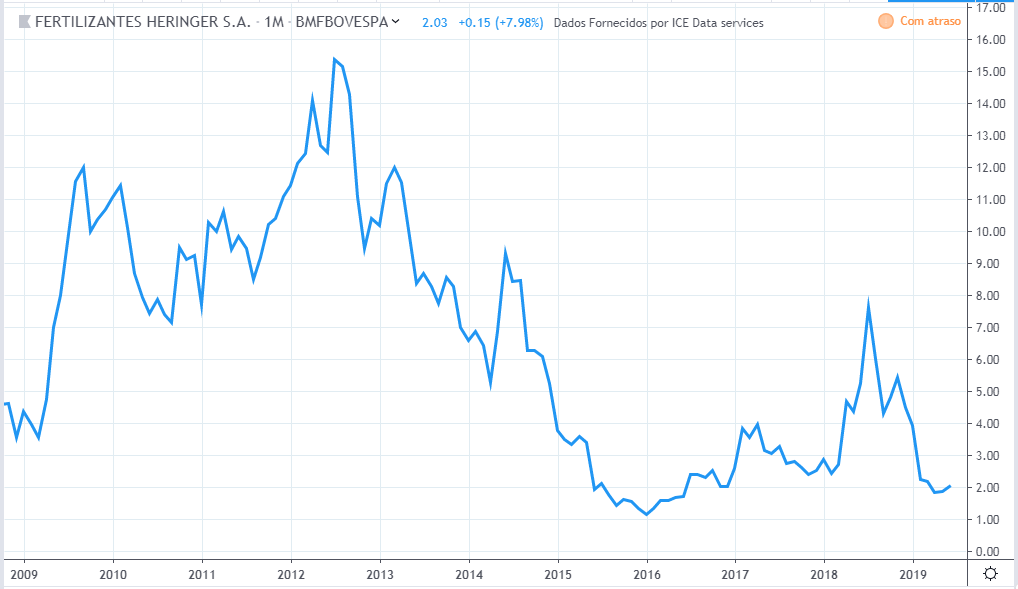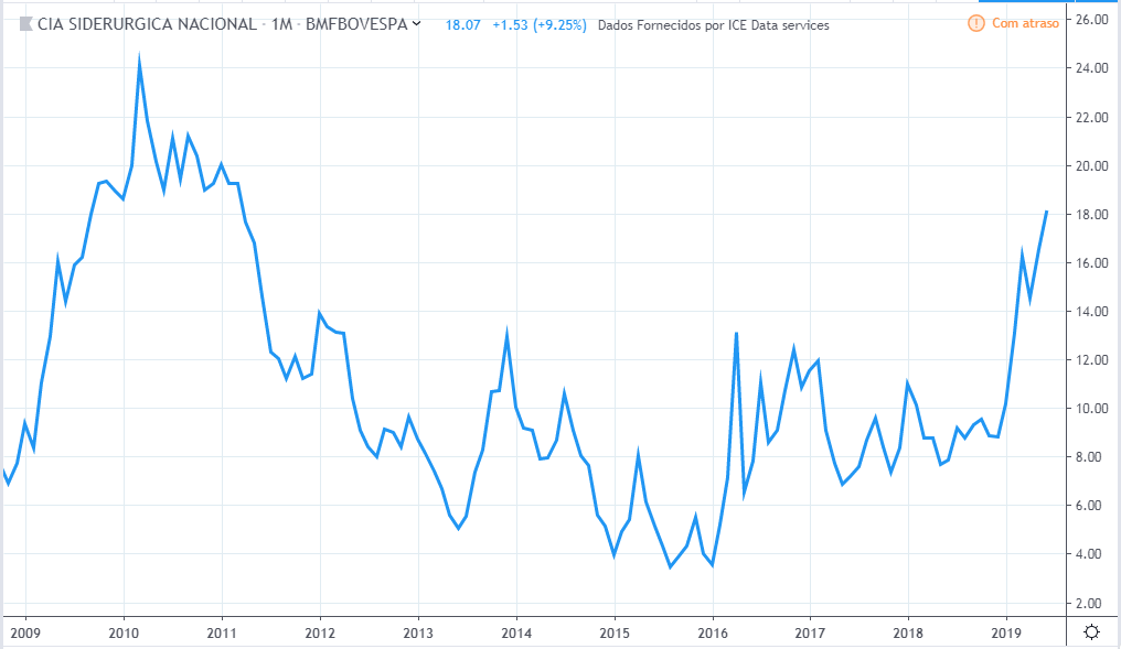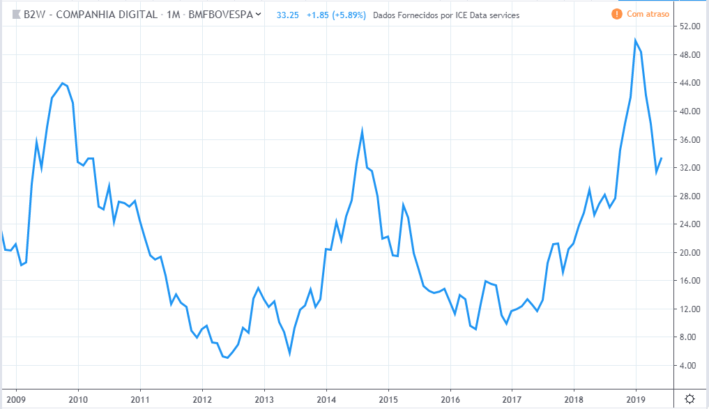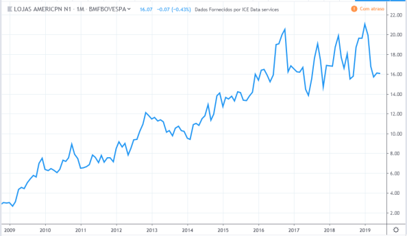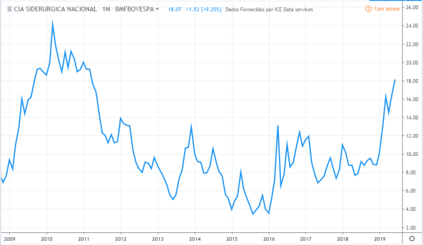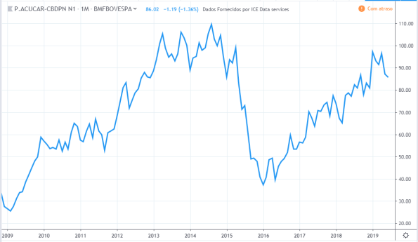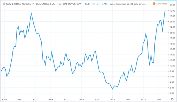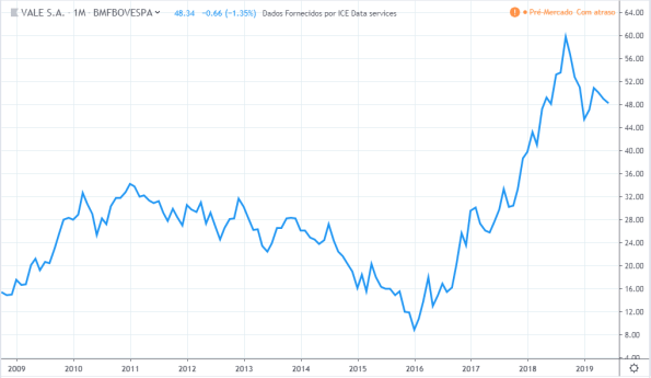 Até meio de 2010 o lucro e preço estavam subindo. Do meio de 2010 até meio de 2011 o lucro continuou subindo e os preços cairam cerca de 30%. Até o meio de 2015 o comportamento de lucro e preço foram semelhantes. O lucro continuou a cair até fim de 2016 sendo que o preço subiu nesse período. Em 2019 os preços atingiram topos históricos mas o lucro continuou estagnado com valores de 2015.