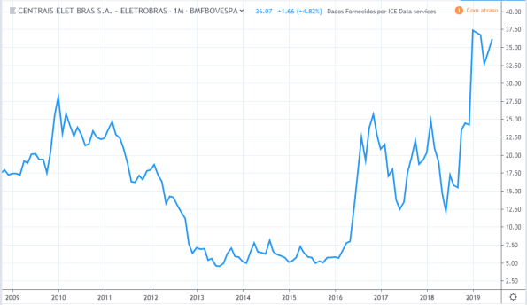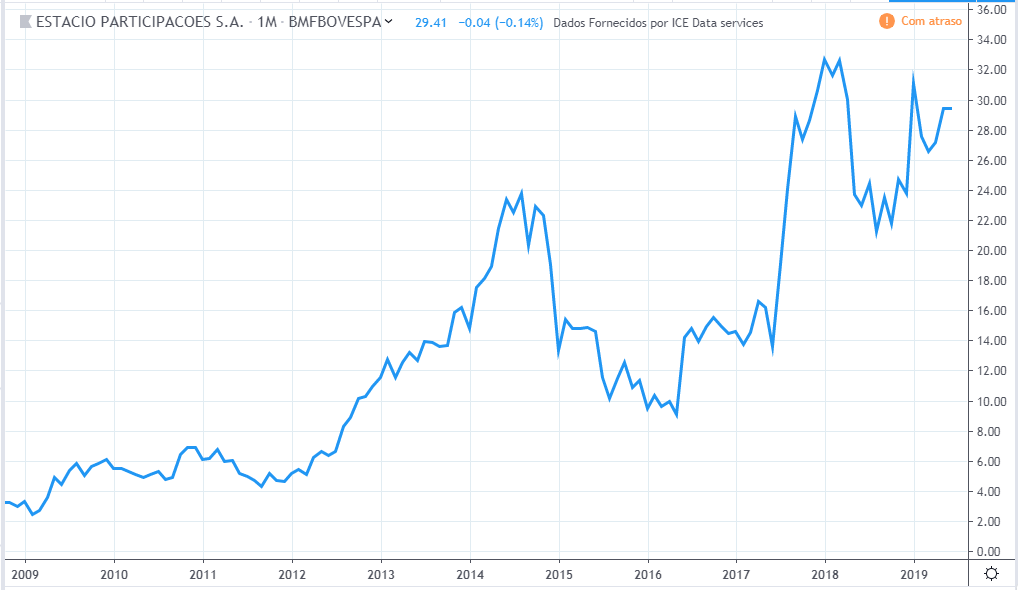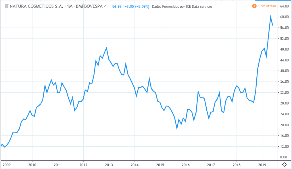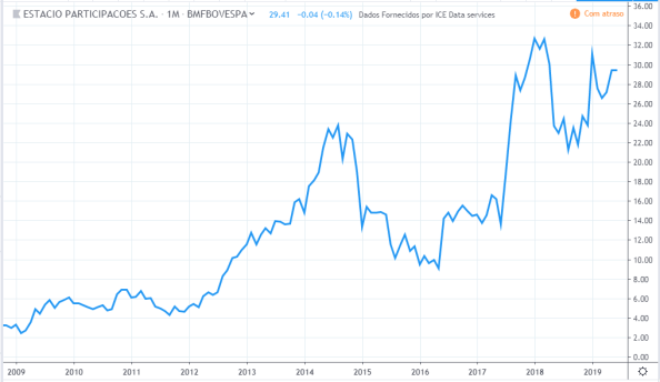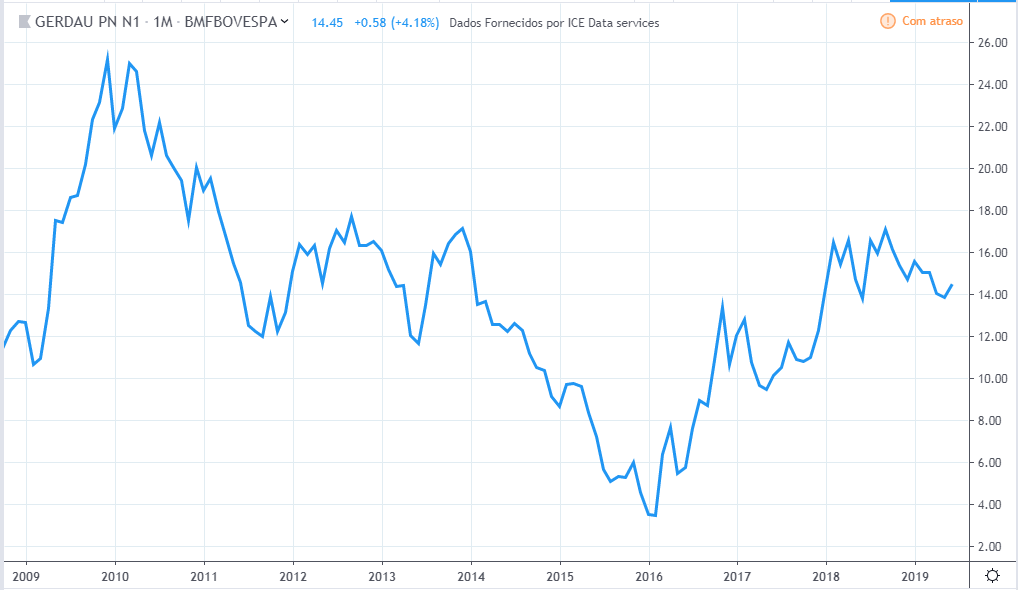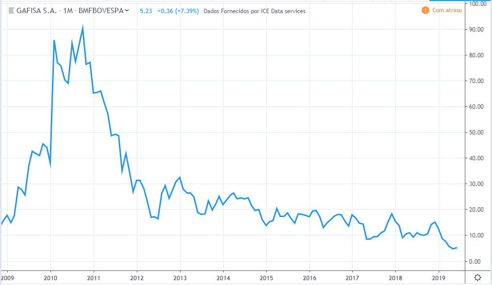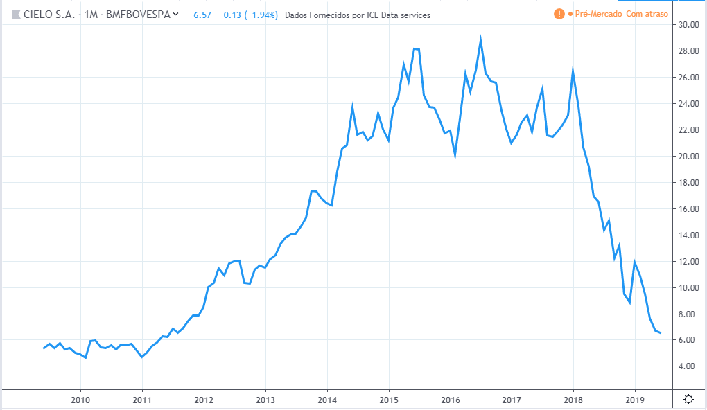 O lucro da empresa basicamente só caiu, de 2009 a 2019, tendo alguns poucos momentos de tentativa de recuperação. Já a ação teve um bom momento em 2009, novamente em 2013 até meio de 2014 e por fim de 2017 até 2018, e o preço atual de 2019 bem acima de 10 anos atrás, muito diferente da curva do lucro.
