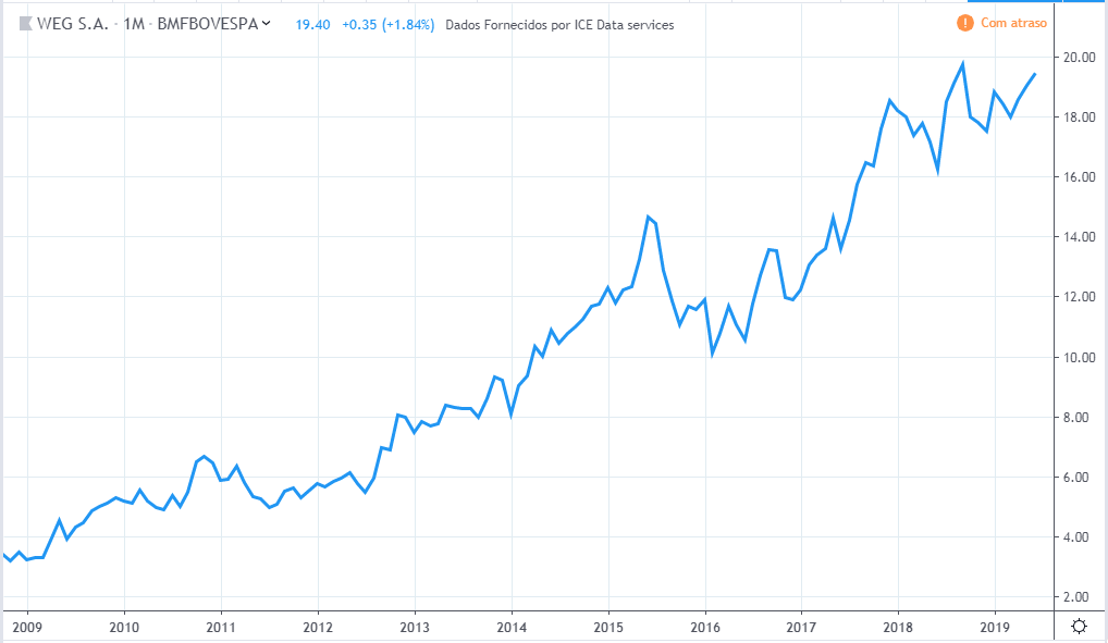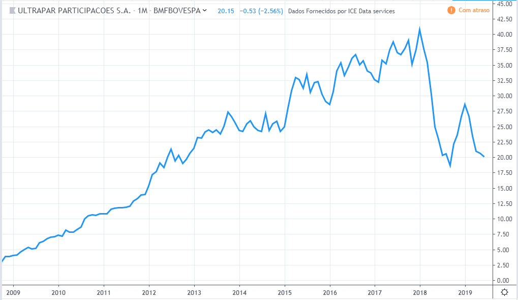 O preço e lucro tiveram movimentos semelhantes porém com proporções muito diferentes. No meio de 2019 o preço está fazendo topo histórico enquanto o lucro está num patamar de 10 anos atrás.